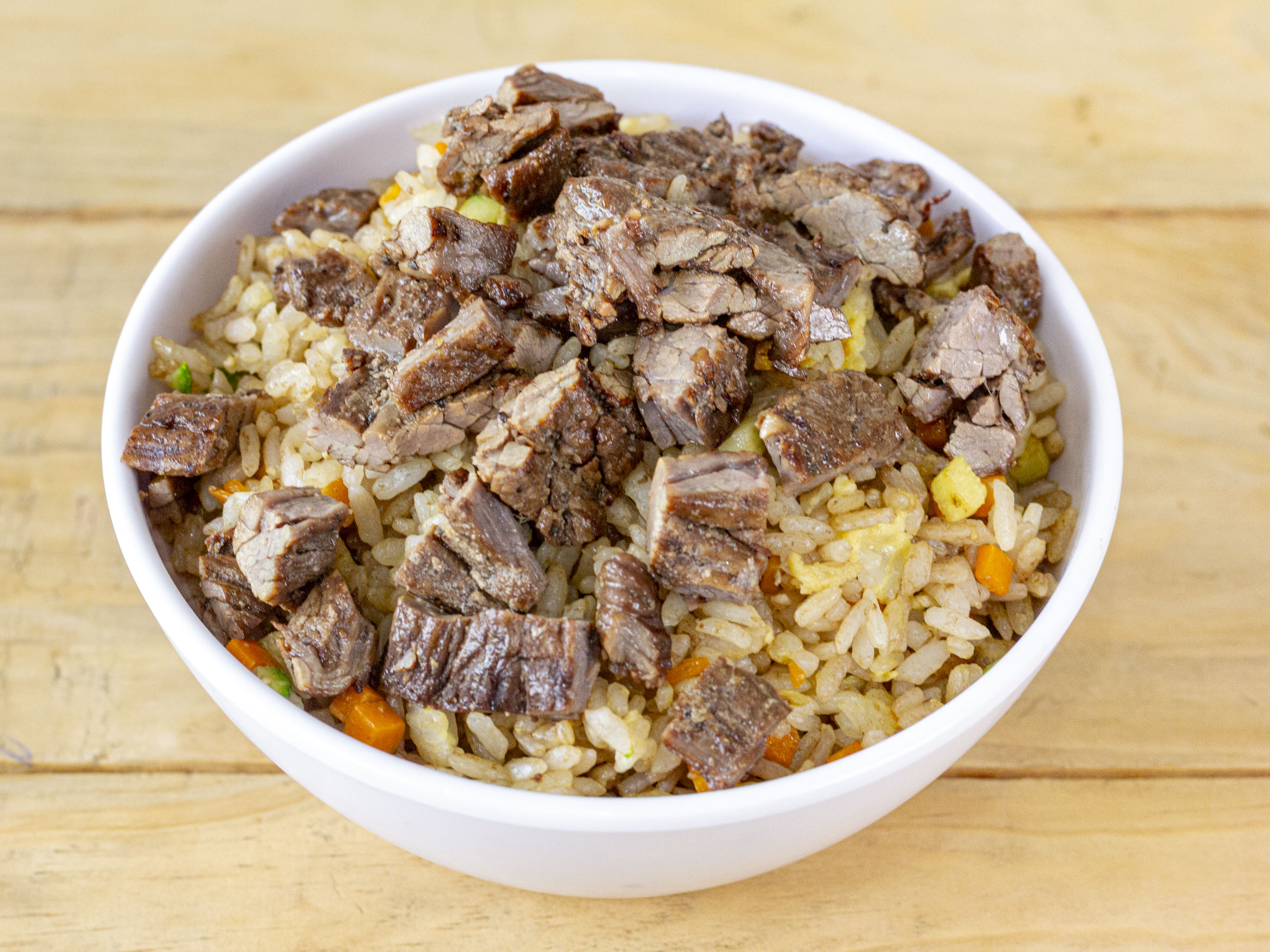 Arroz frito con verduras, huevo, salsa de soya y carne de res