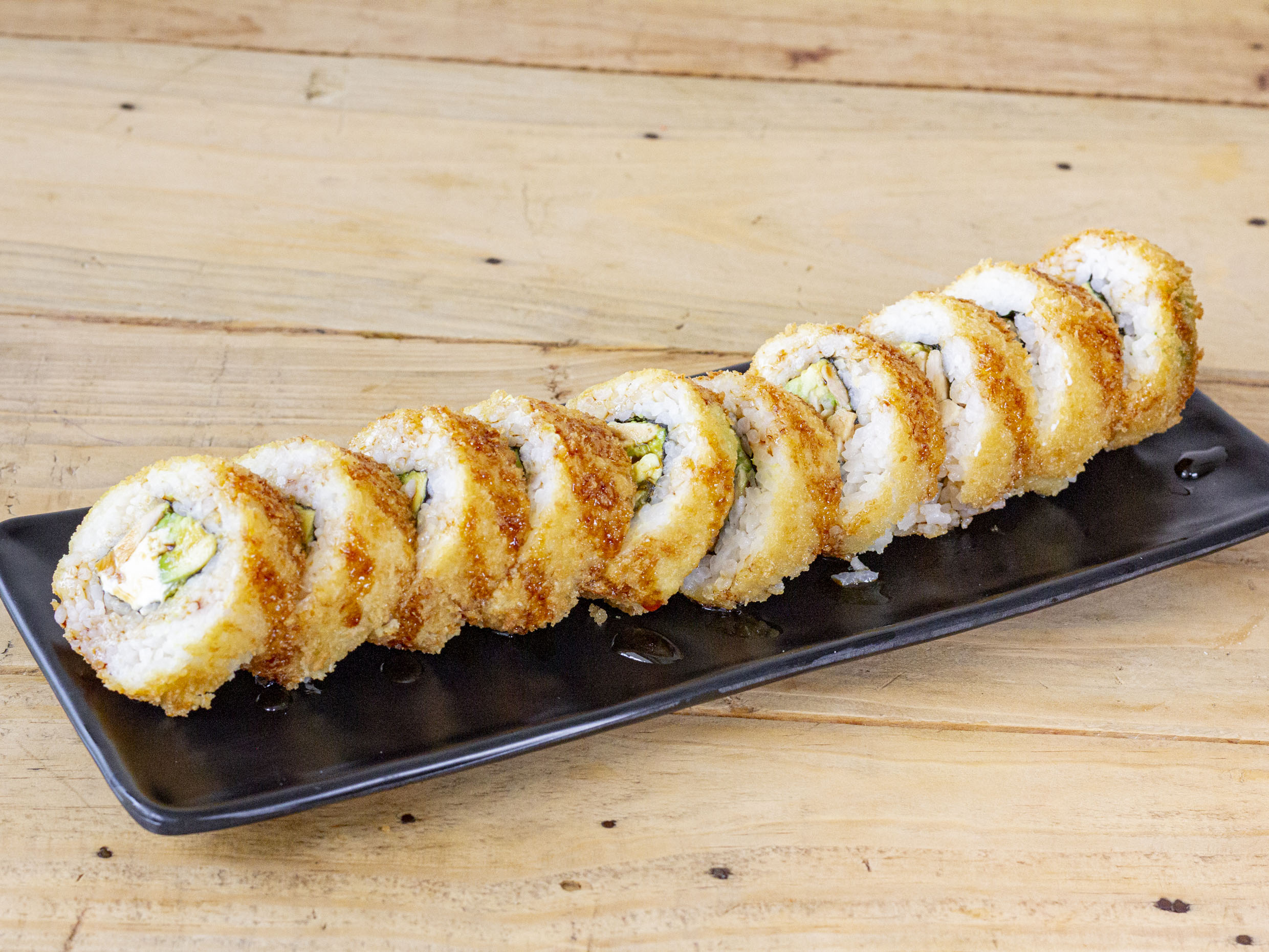 ROLLO RELLENO DE SURIMI EMPANIZADO Y AGUACATE, CUBIERTO DE QUESO GOUDA Y CHILES TORERADOS (no 2x1)