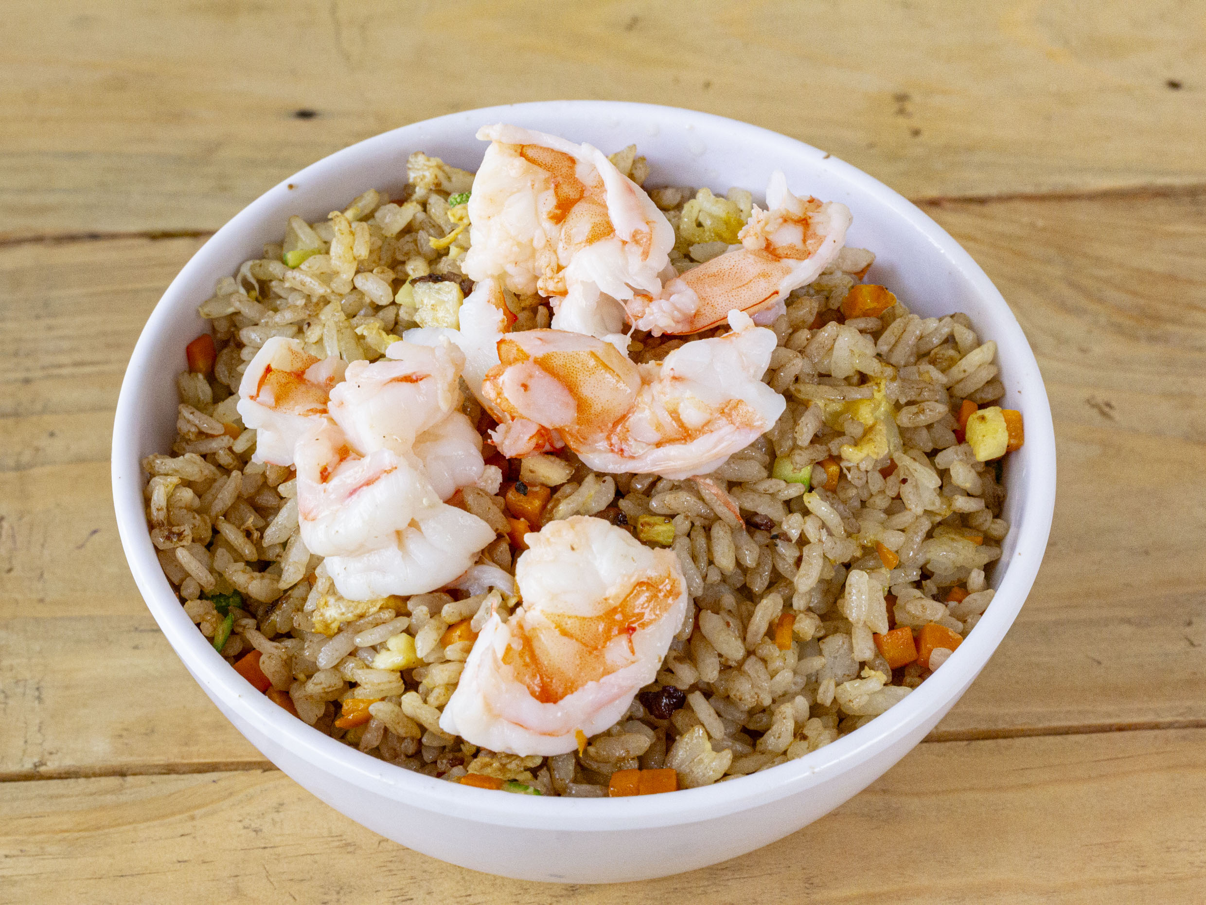Arroz frito con verduras, huevo, salsa de soya y camarón.