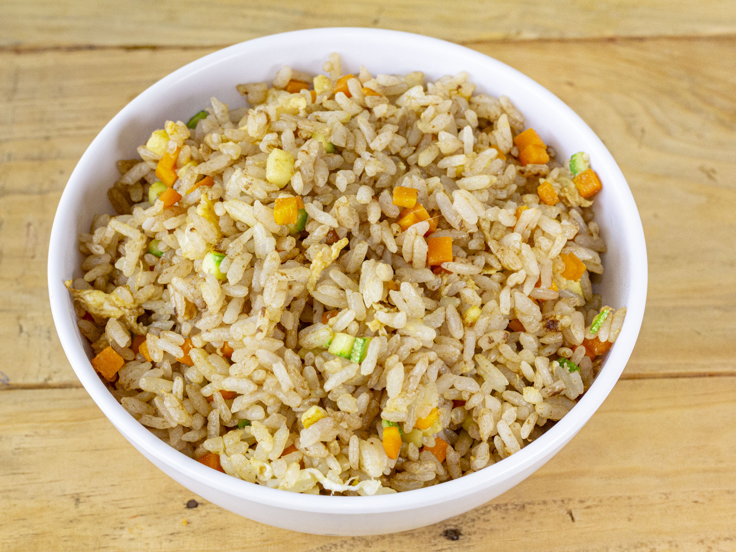 Arroz frito con verduras, huevo y salsa de soya. Res, pollo y camarón.