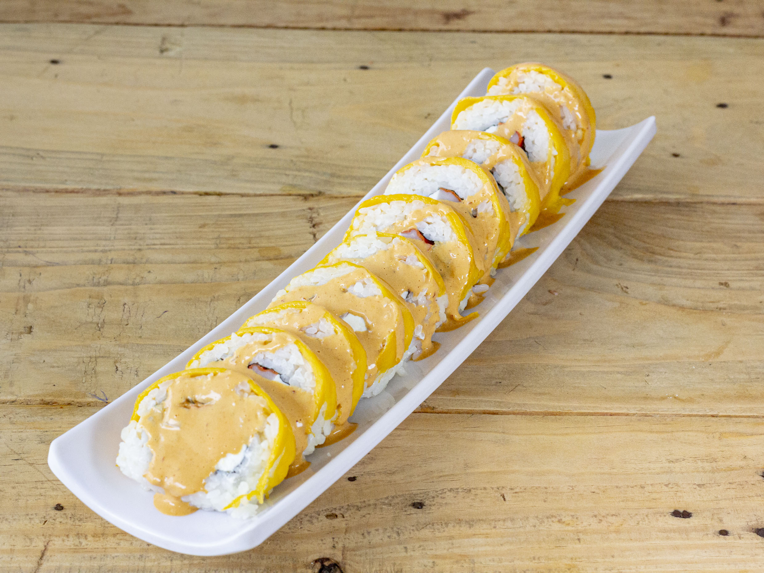 ROLLO RELLENO DE CAMARON EMPANIZADO Y AGUACATE, CUBIERTO DE QUESO CREMA Y PASTA TAMPICO (no 2x1)