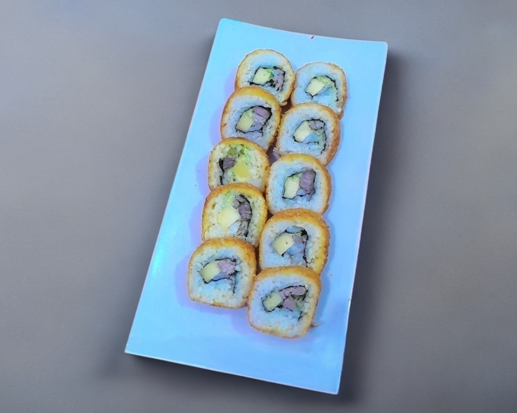 Int. Queso gouda, camarón, aguacate y filete de res. Ext. Empanizado