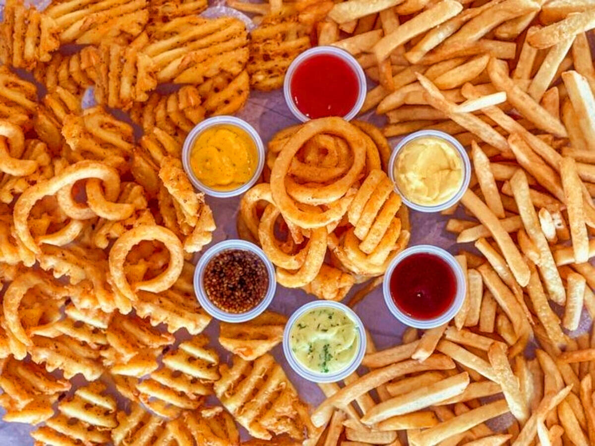 Elige uno de nuestros estilos súper crujientes de papas sazonadas y aros de cebolla. Elige 1 tipo de aderezo.