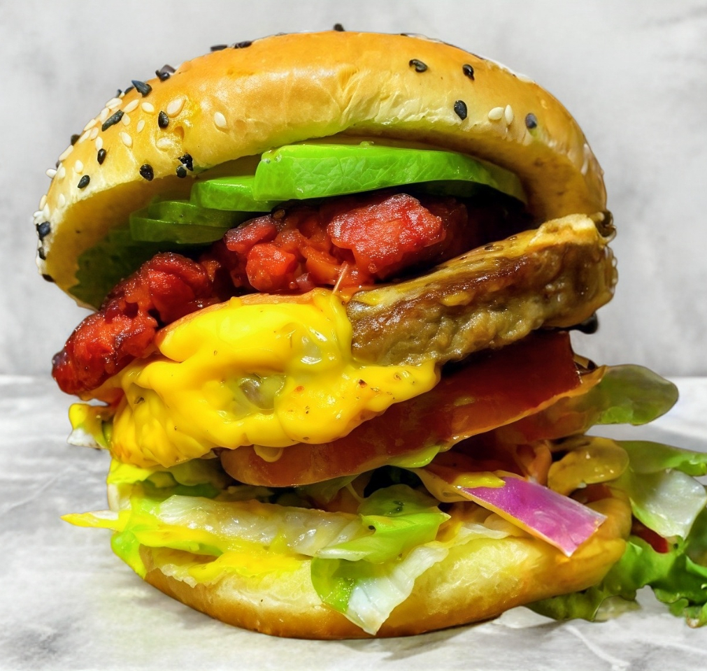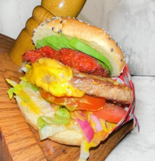 ¡Con todo el sabor de México! Carne 80/20, queso asadero, queso amarillo, tocino, chorizo y una rebanada de cremoso aguacate.