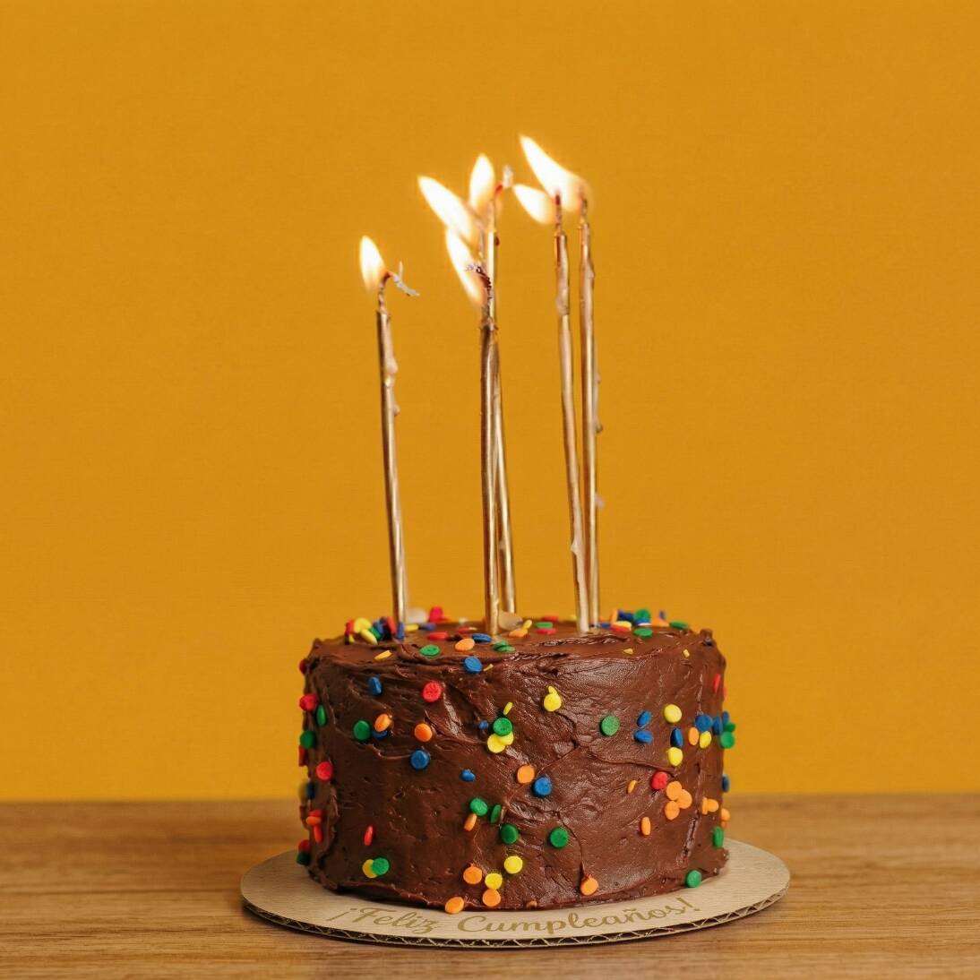 Pequito de vainilla humectado con jarabe dulce y cubierto con betún Chocolate y decorado con chispas de colores por dentro y por fuera.