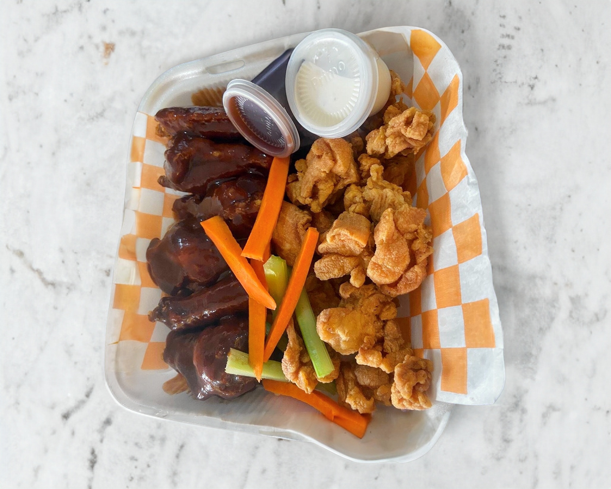 Incluye medio kilo de alitas, medio kilo de boneless, una orden de papa a la francesa y una orden de dedos de queso.