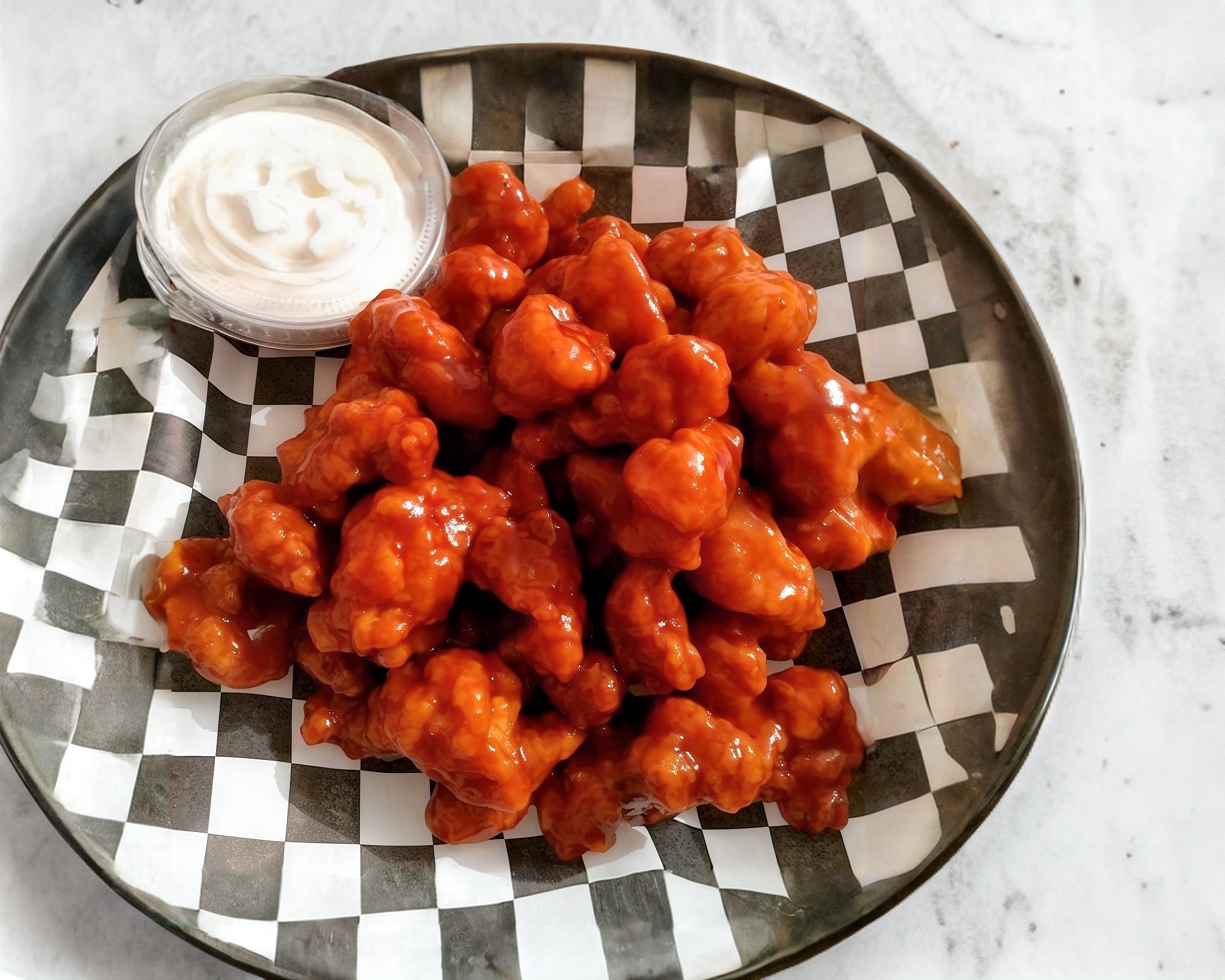 500 grs de pollo (en crudo) deliciosamente condimentado,empanizado y frito cubierto en 1 a 2 de tus salsas preferidas. Inluye 1oz de ranch, zanahoria y apio