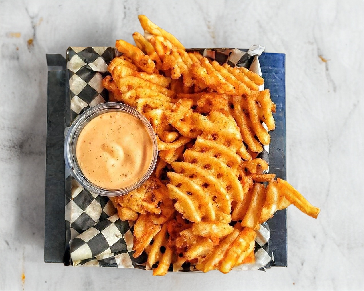 La orden consta en 2 banderillas en forma de waffle, incluye un dip de 2oz de catsup.