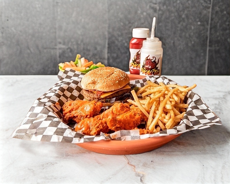 Incluye un kilo de alitas, 4 burgers de sirloin y medio kilo de papas a la francesa.
