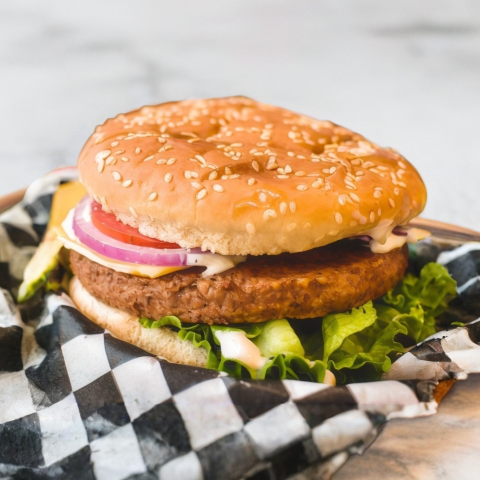 Hamburguesa de sirloin con queso blanco y tocino, incluye jitomate, cebolla blanca, pepinillo, lechuga, aderezo ahumado, 180 grs de papa a la francesa y un refresco de sabor de 400ml.