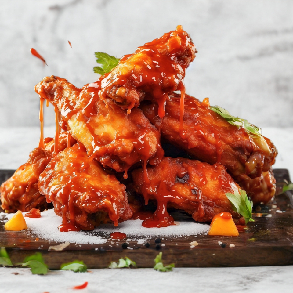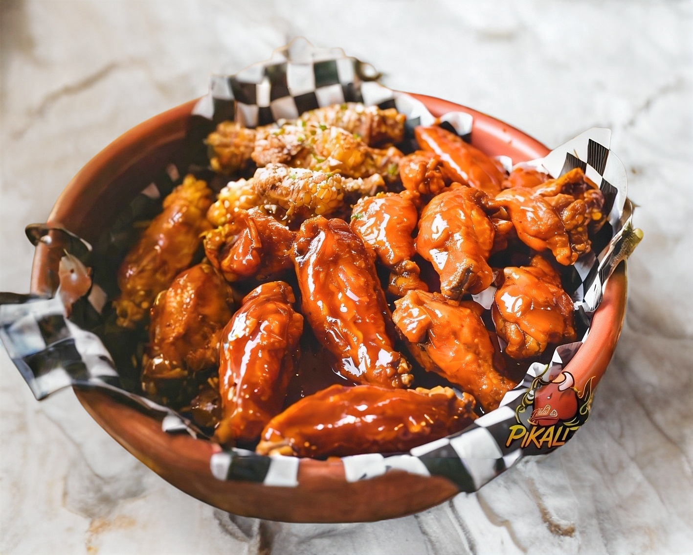 (1kg en crudo, 850grs bañadas) Bañadas en 1 a 3 salsas a su eleccion, incluye zanahoria, apio y un dip de 2oz de aderezo ranch.