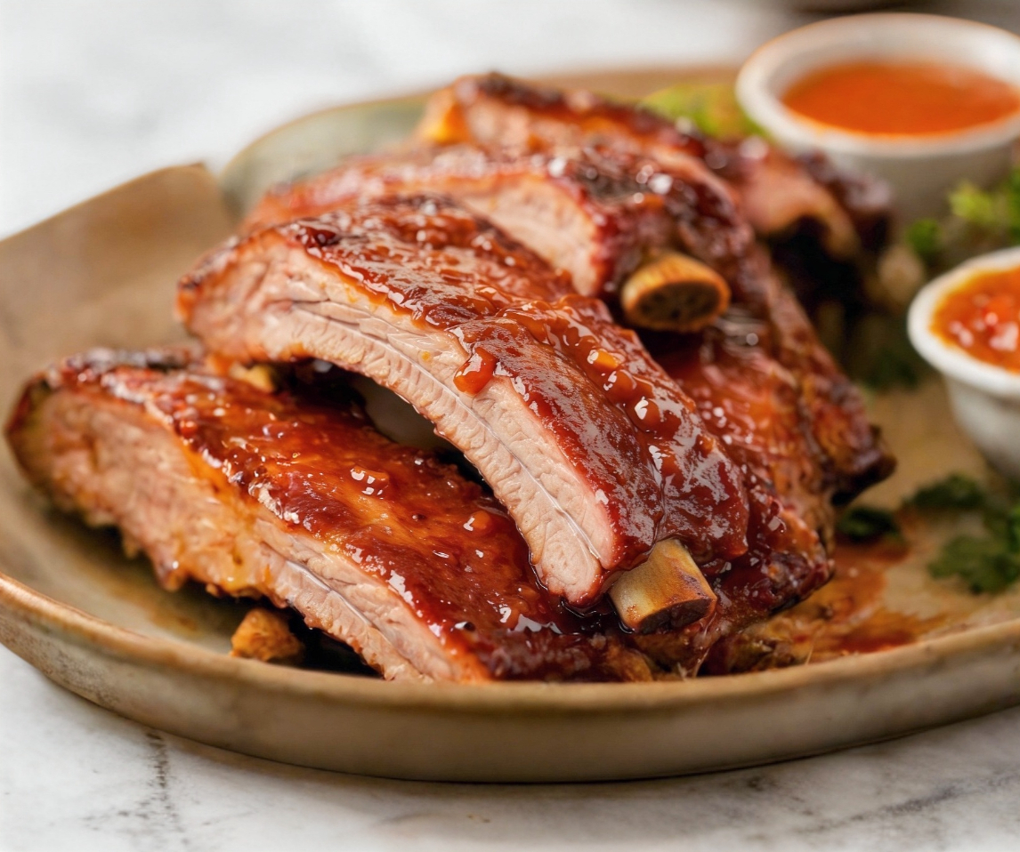 Un kilo de costilla de cerdo (1kg en crudo, bañadas 850grs.) Bañadas en 1 a 3 salsas a su eleccion.