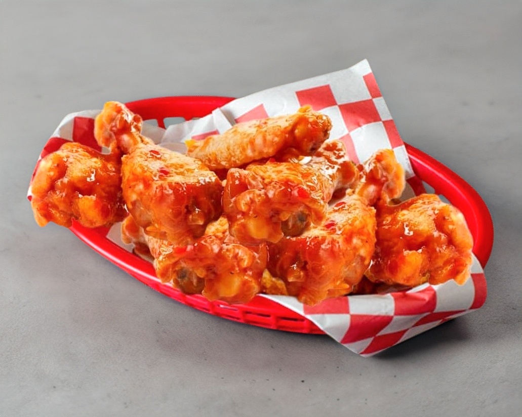 22 Piezas de alitas bañadas en salsa de tu elección. Incluye aderezo ranch y vegetales: zanahoria y apio
