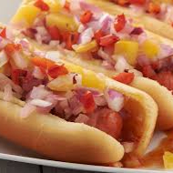 3 Hot Dog, piezas Salchicha, mayonesa, mostaza, captsu, cebolla frita y tocino
