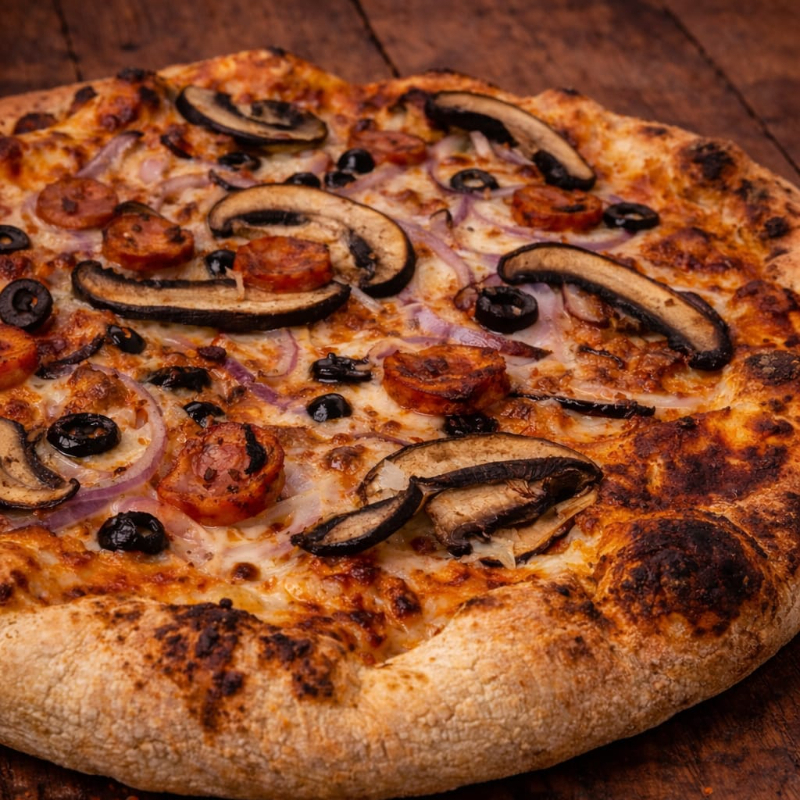 Salsa pomodoro, queso mozzarella, parmesano, cebolla morada, salchicha polaca ahumada, hongo portobello y aceitunas negras. Tamaño grande 35 cm