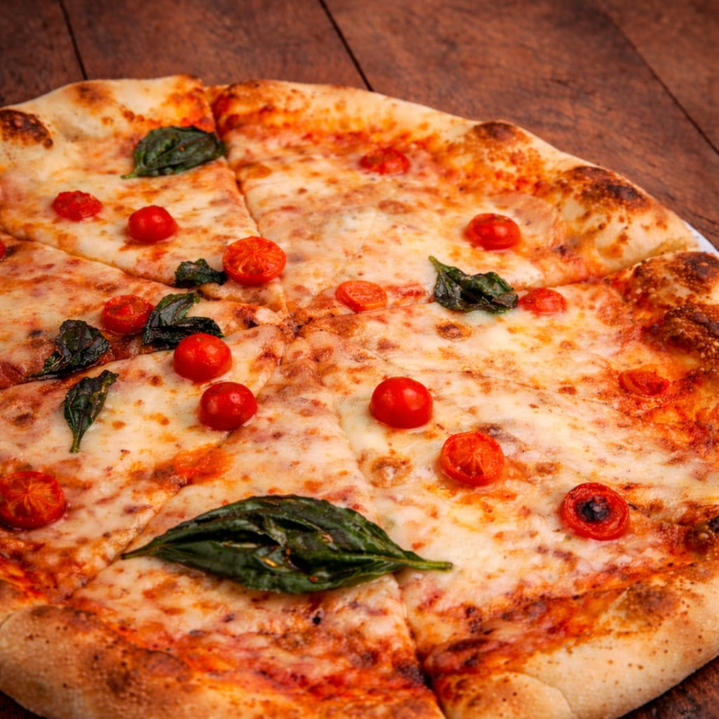Salsa pomodoro, queso mozzarella, parmesano, hojas de albahaca fresca, tomate cherry y aceite de oliva. Tamaño grande 35 cm
