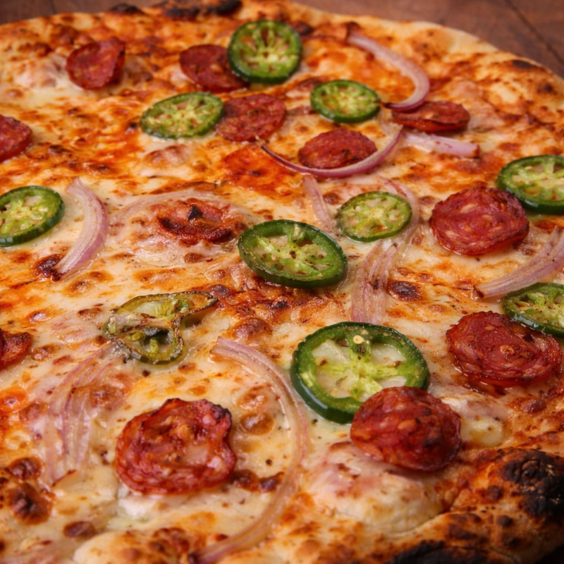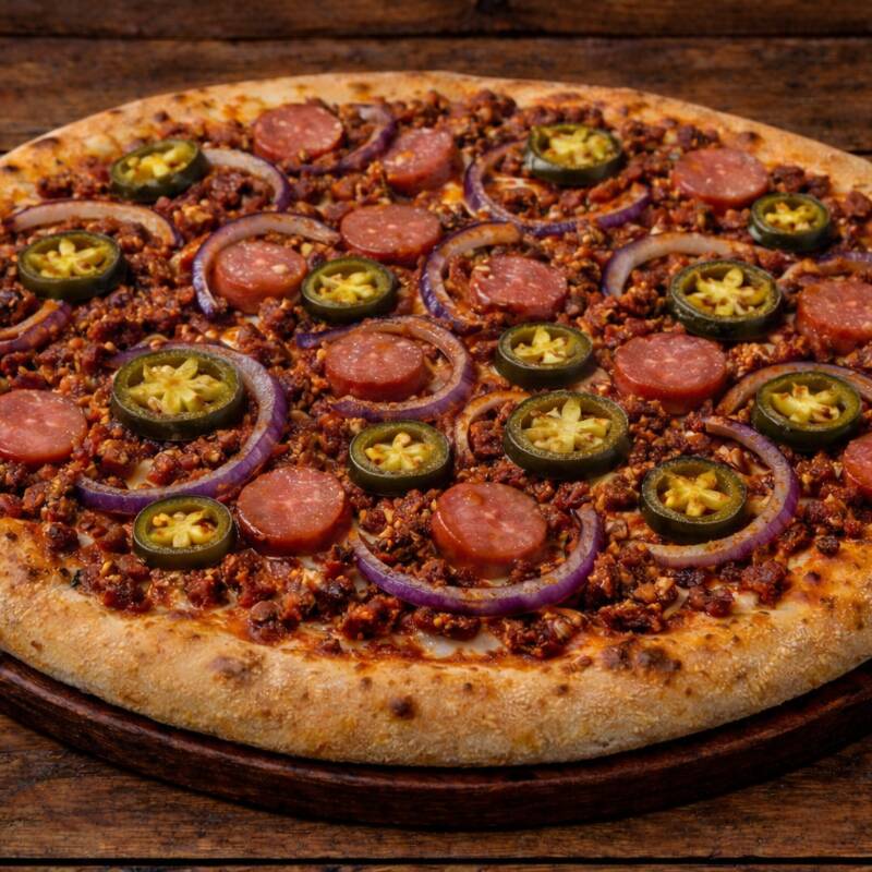 Salsa pomodoro, queso mozzarella, parmesano, chorizo, salchicha, cebolla morada y jalapeño. Tamaño grande 35 cm