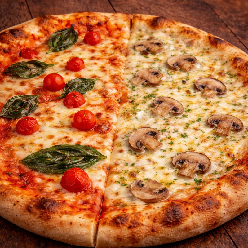 Mitad de la pizza con base de salsa pomodoro, queso mozzarella, parmesano, albahaca, tomate cherry y aceite de oliva y la otra mitad con base de mantequilla de ajo a las finas hierbas, queso mozzarella, parmesano y champiñones. Tamaño grande de 35 cm.