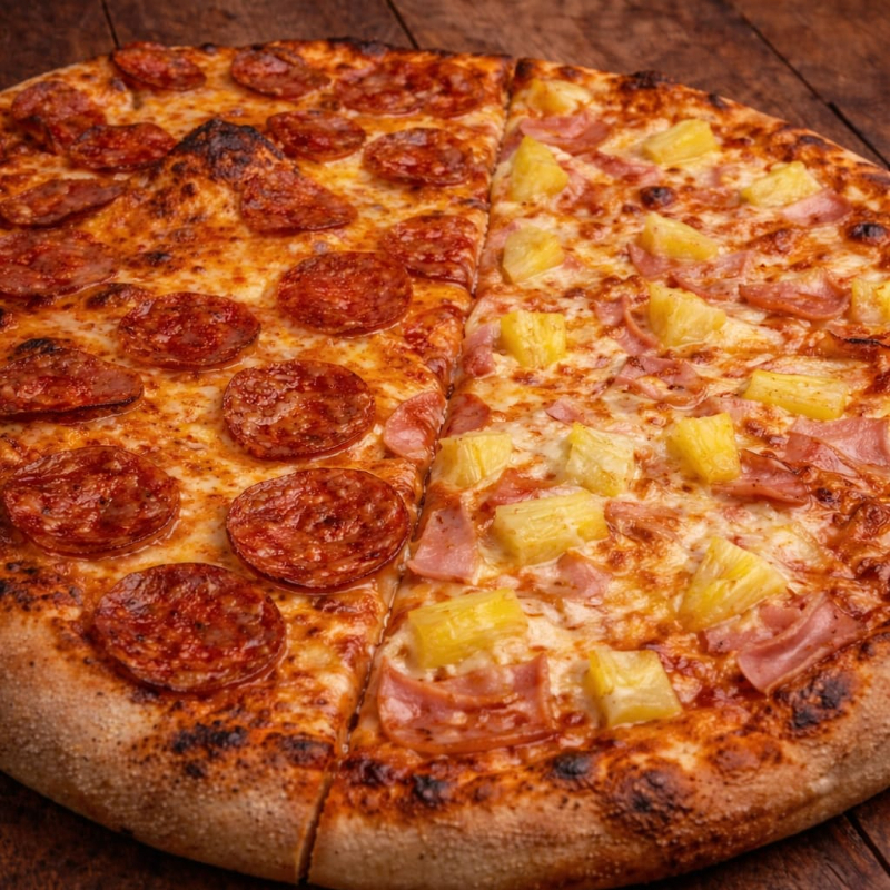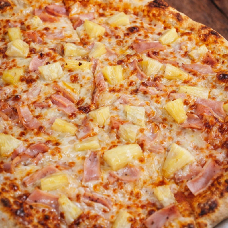 Salsa pomodoro, queso mozzarella, parmesano, pepperoni, jamon de pierna, piña ahumada. Tamaño grande 35 cm.
