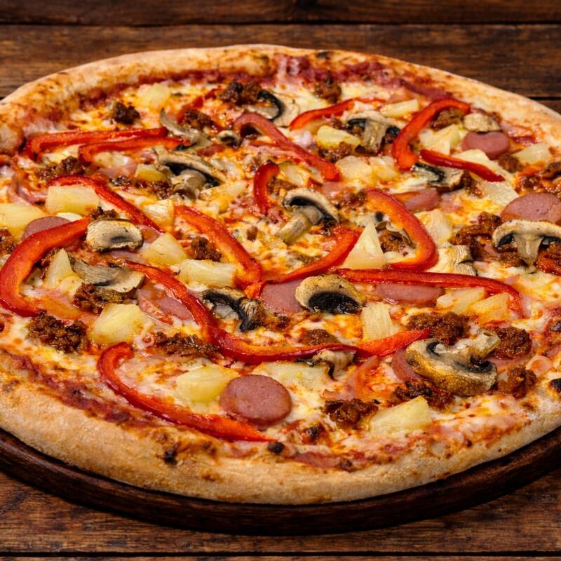 Salsa pomodoro, queso mozzarella, parmesano, chorizo, salchicha, jamón, champiñón, piña y morrón. Tamaño grande 35 cm.