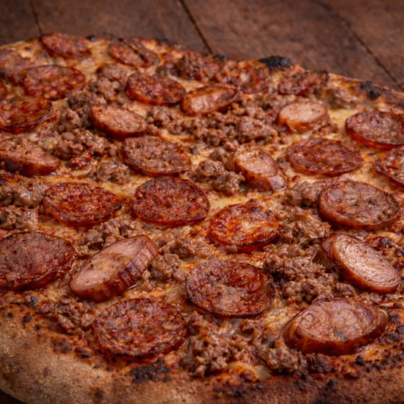 Salsa pomodoro, queso mozzarella, pepperoni, salchicha polaca y salchicha italiana. Tamaño grande 35 cm