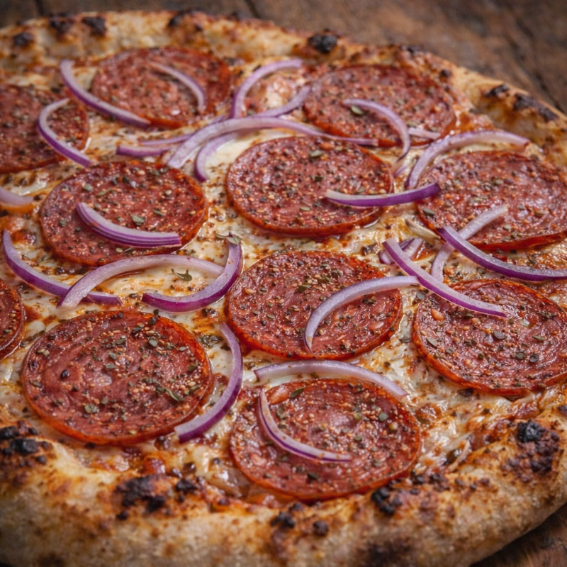 Salsa pomodoro, queso mozzarella, parmesano, salami, cebolla morada y aceite de oliva. Tamaño grande 35 cm