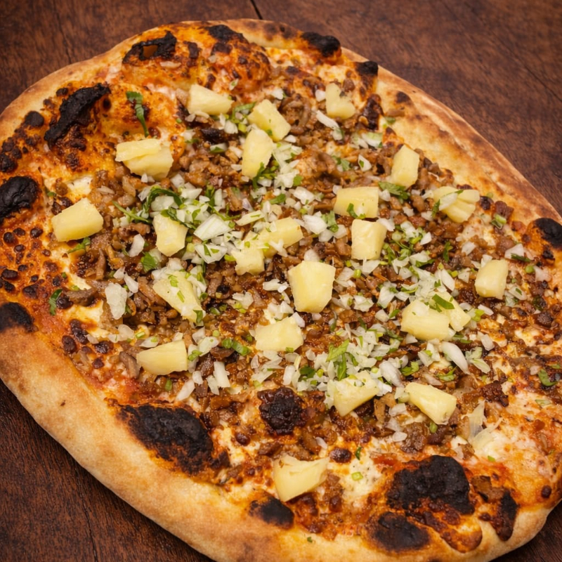Salsa pomodoro, queso mozzarella, parmesano, carne al pastor, piña ahumada, cebolla y cilantro fresco. Tamaño grande 35 cm