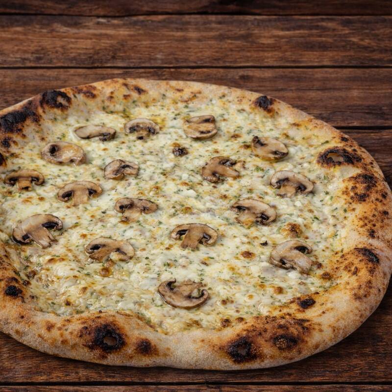 Mantequilla de ajo a las finas hierbas, queso mozzarella, parmesano añejado, champiñones y chile cayena. Tamaño grande 35 cm