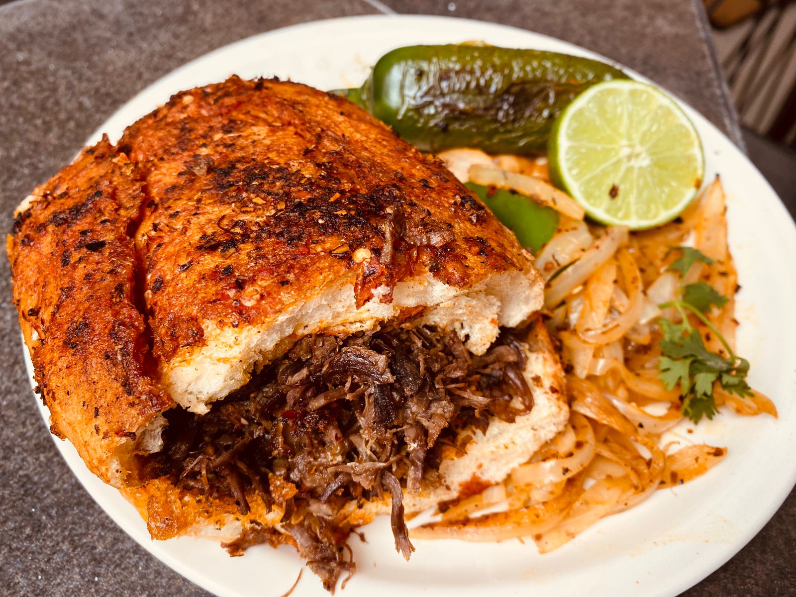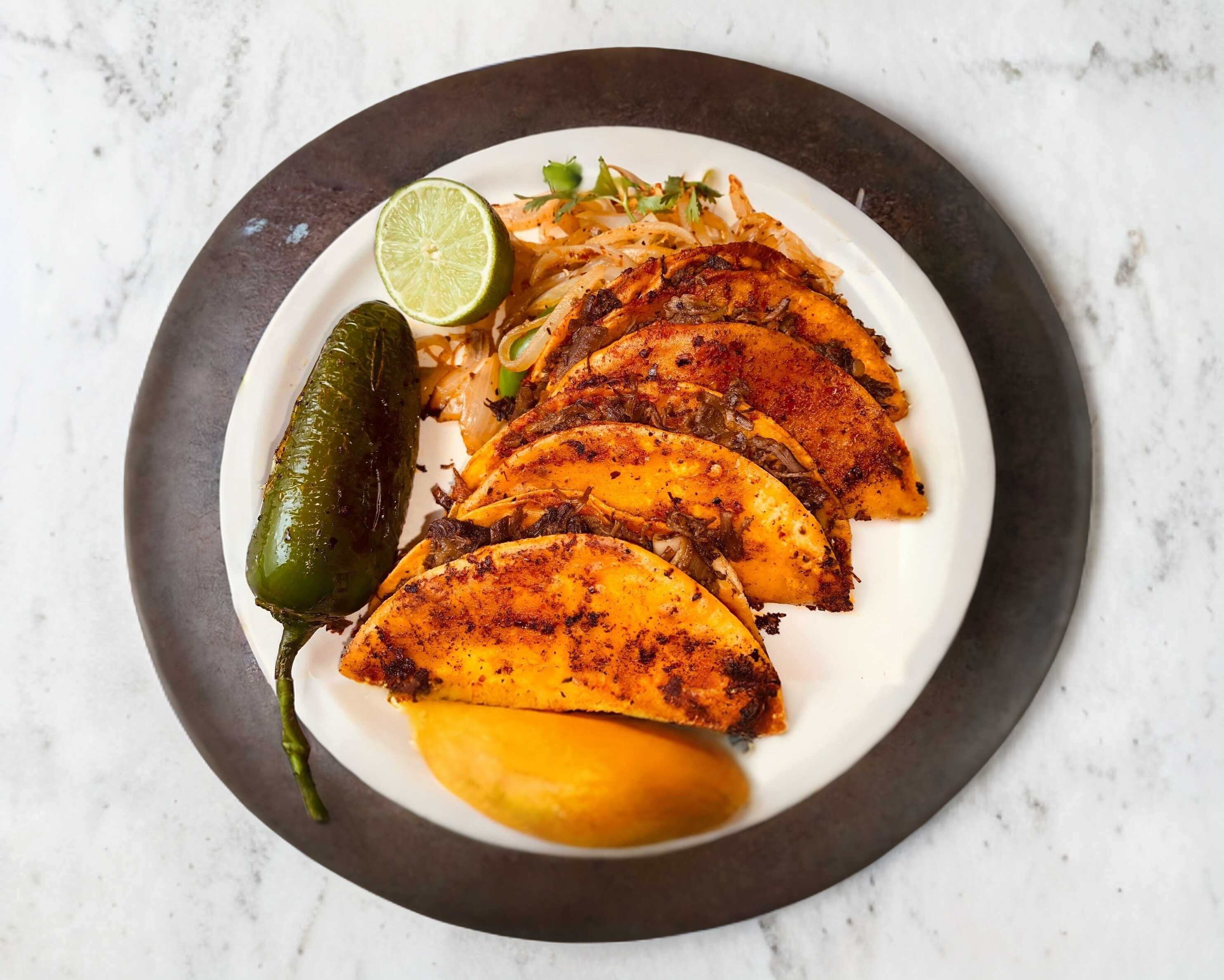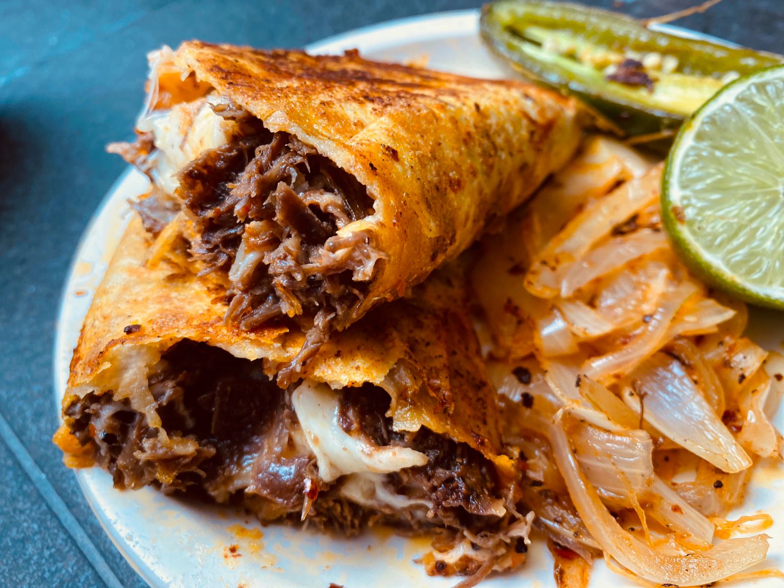 taco dorado relleno de barbacoa y queso fundido acompanado de consome salsa y verduras