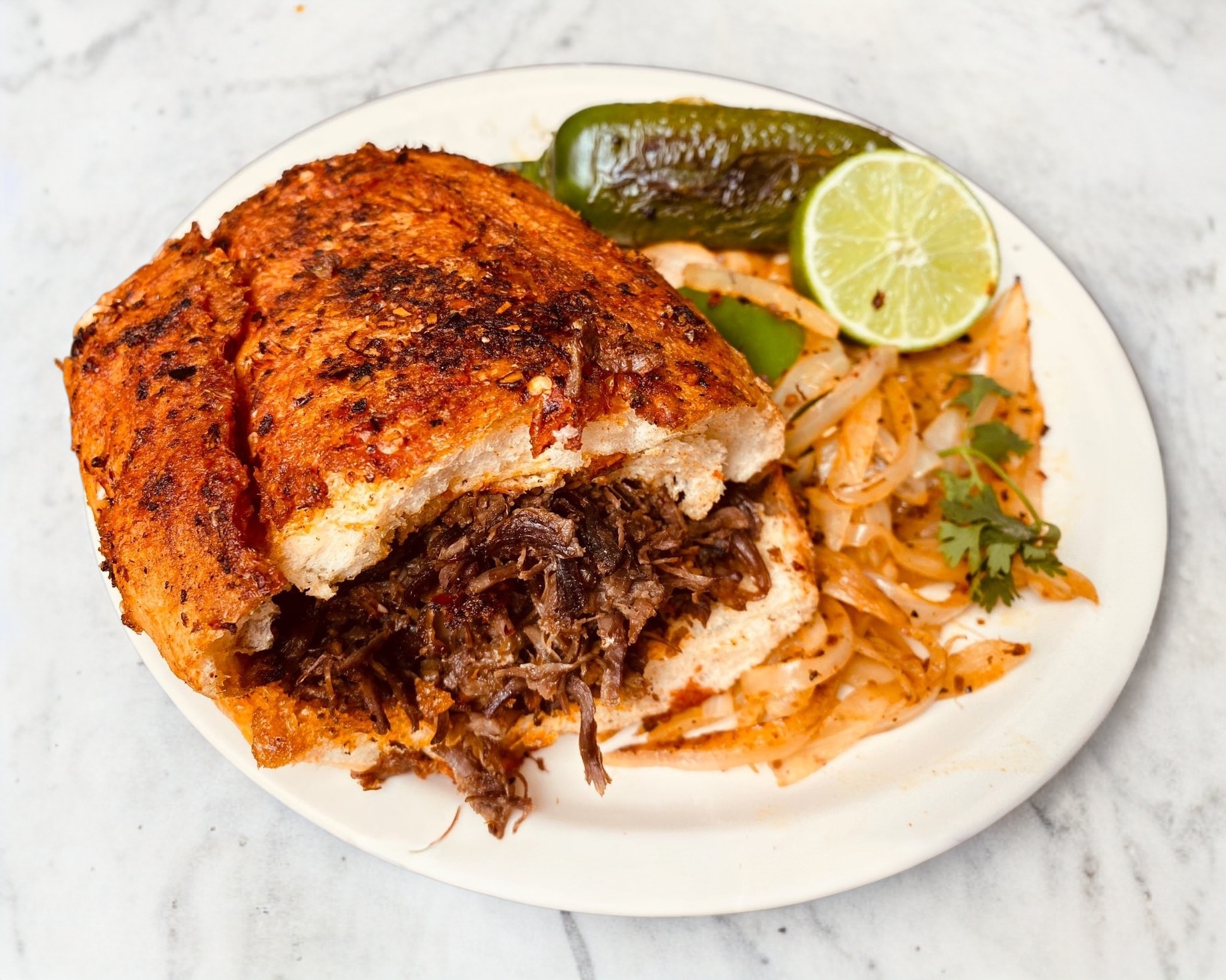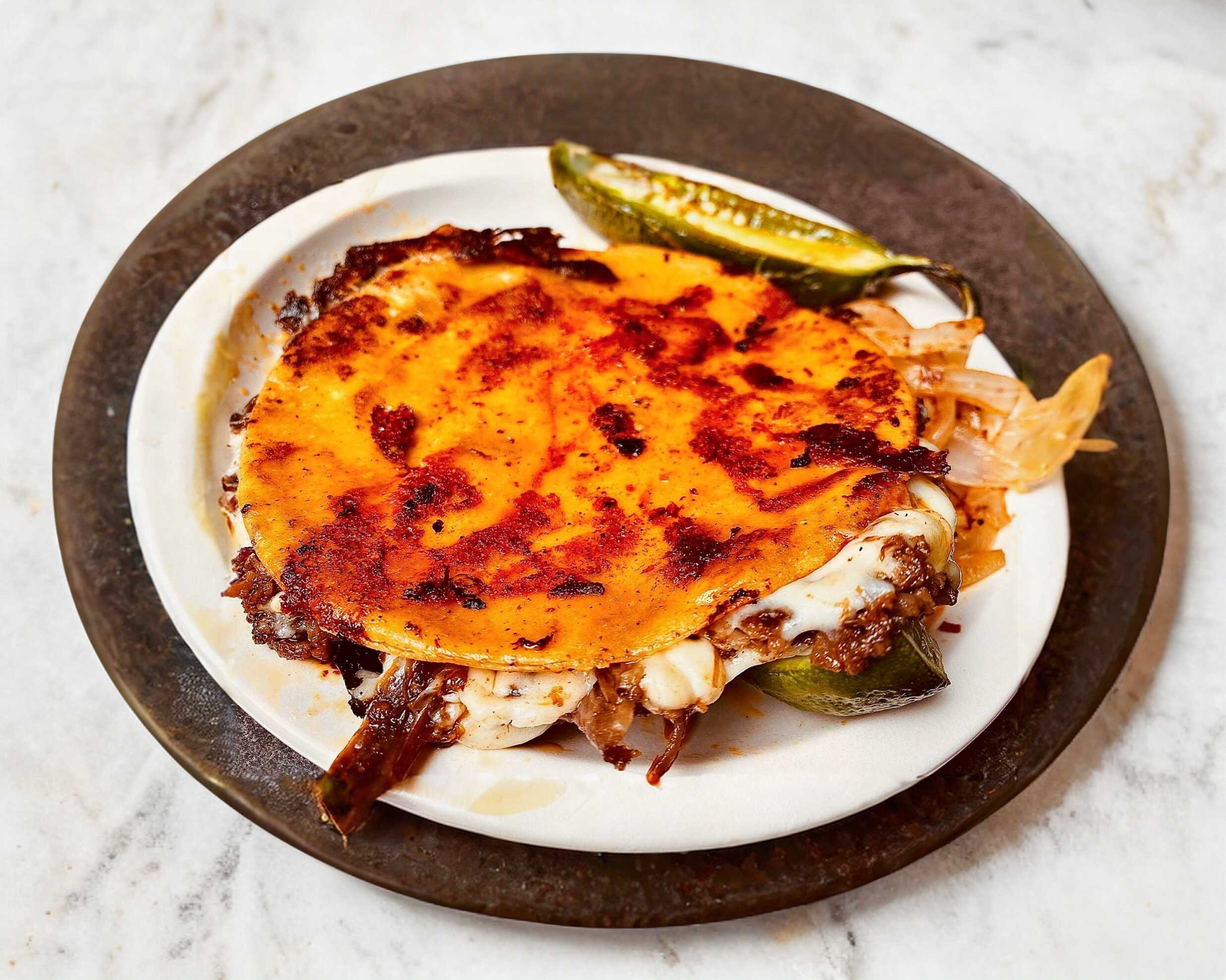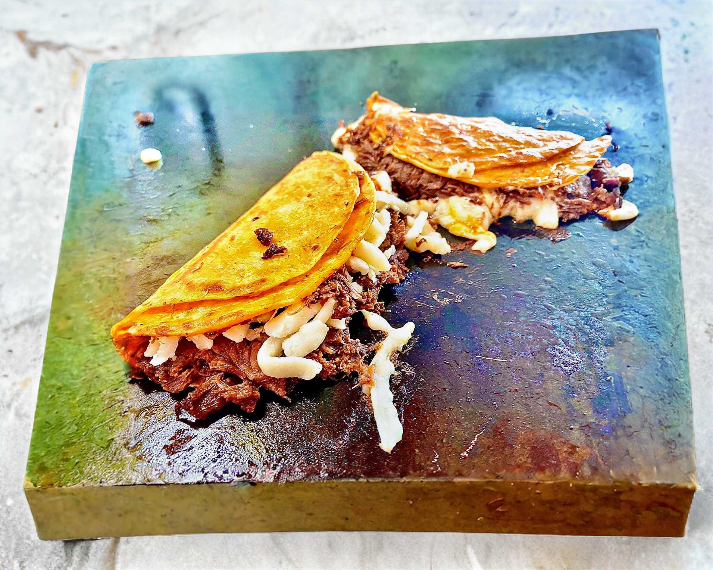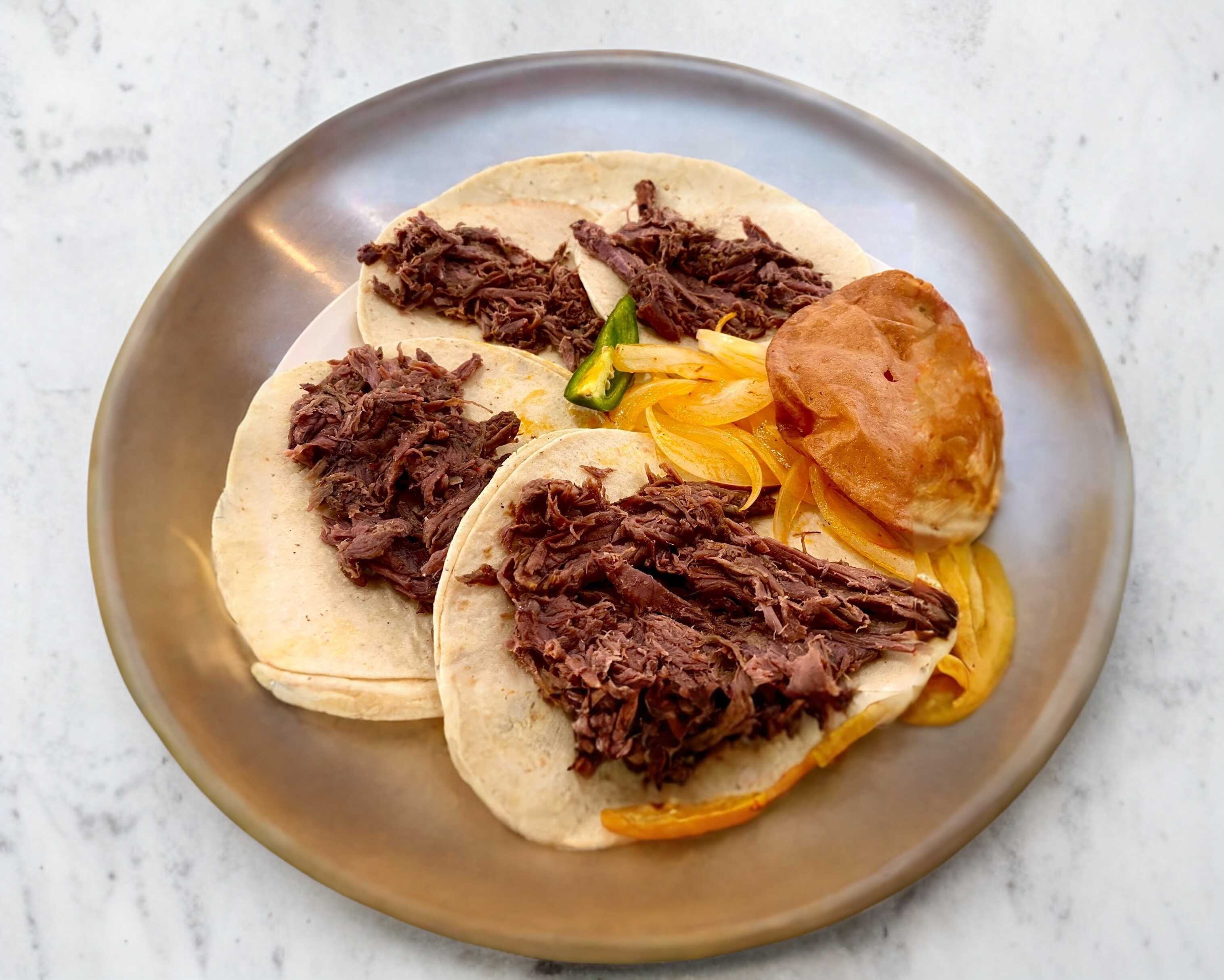 taco blando relleno de barbacoa y queso fundido acompanado de consome salsa y verduras
