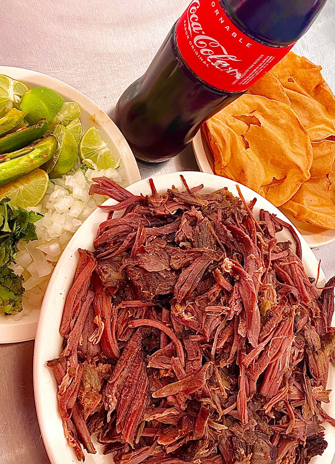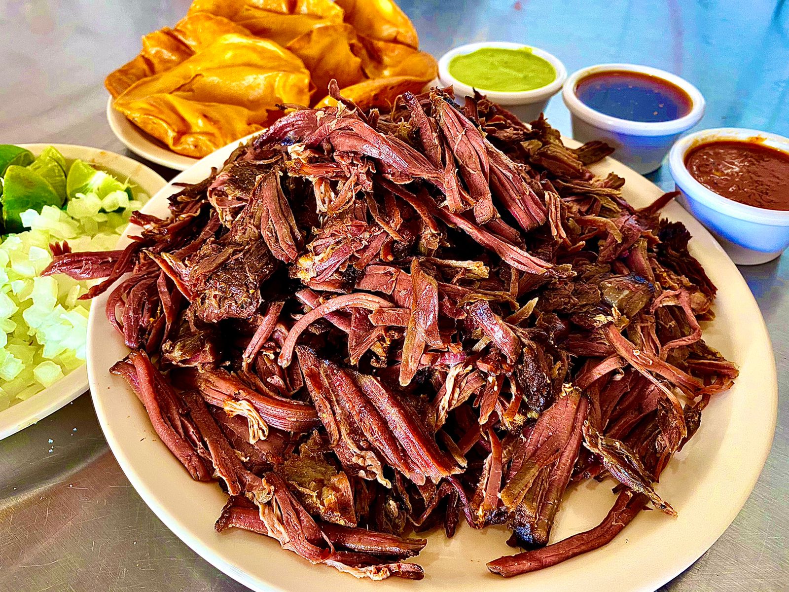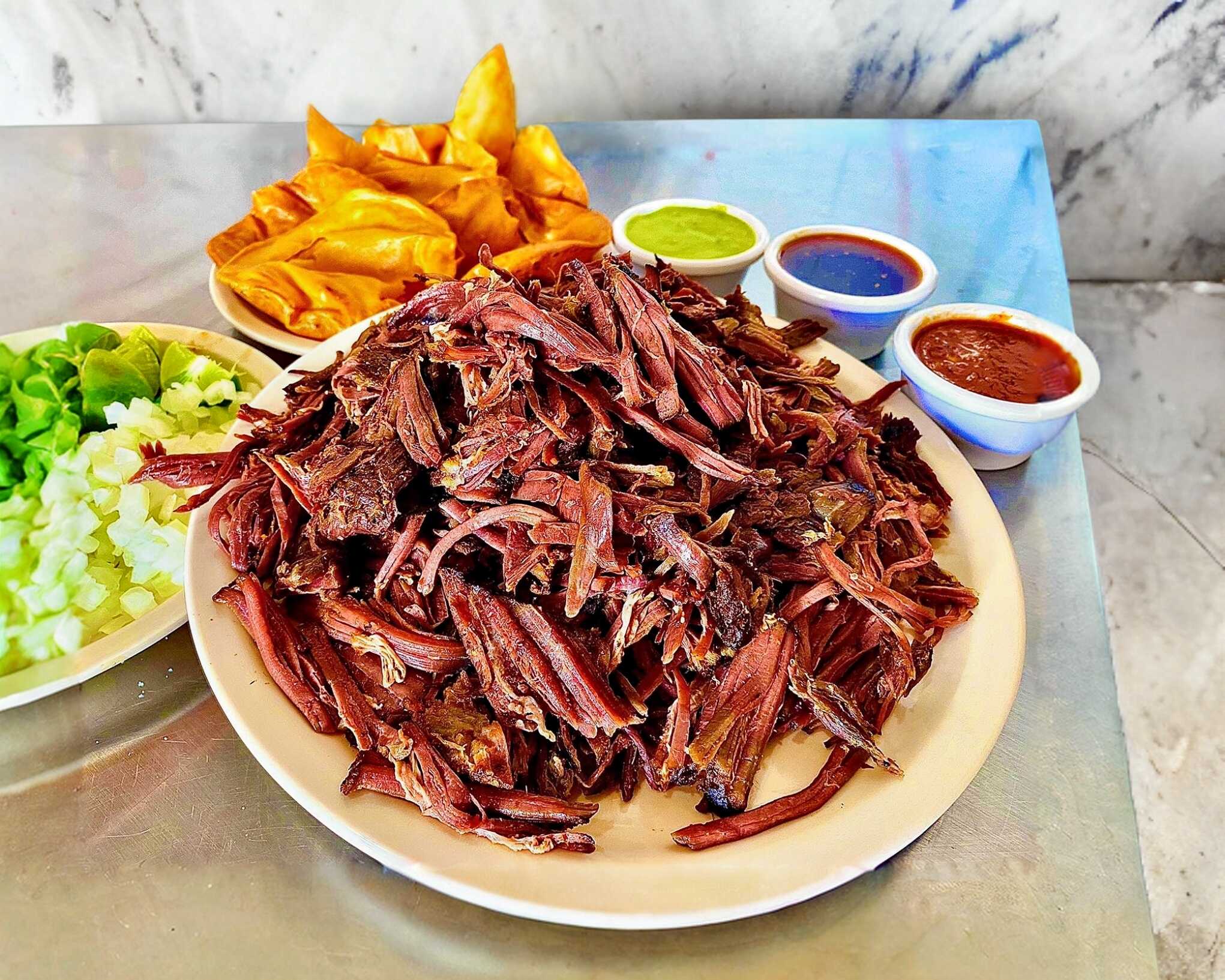 Plato grande de barbacoa (carne de res)de 95 gramos , acompanado de tortillas de harina de maiz, consome (carne),salsa y verduras( cebolla , cilantro, limon)