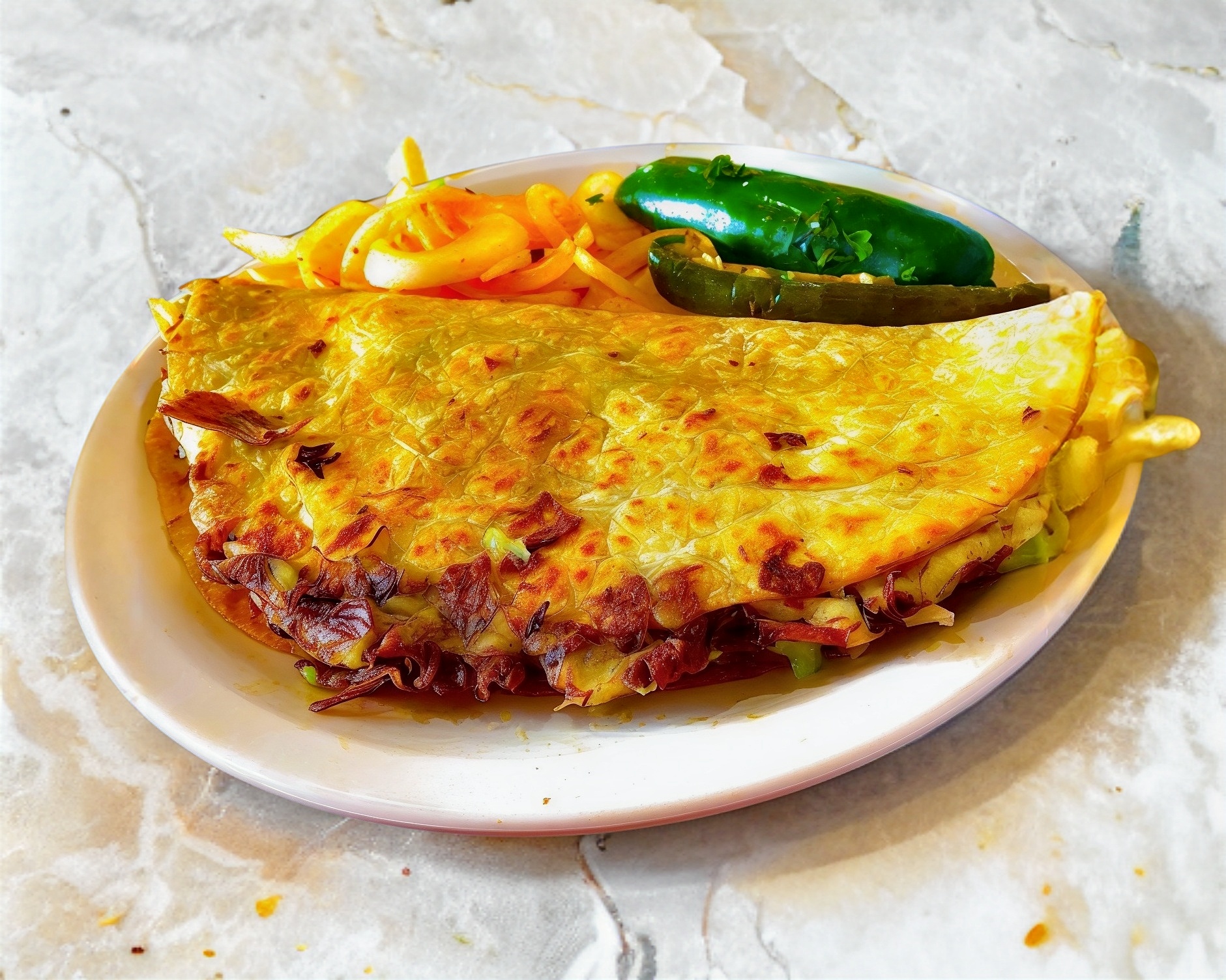 quesadilla doble de tortilla de maiz acompanada de consome, salsa y verduras