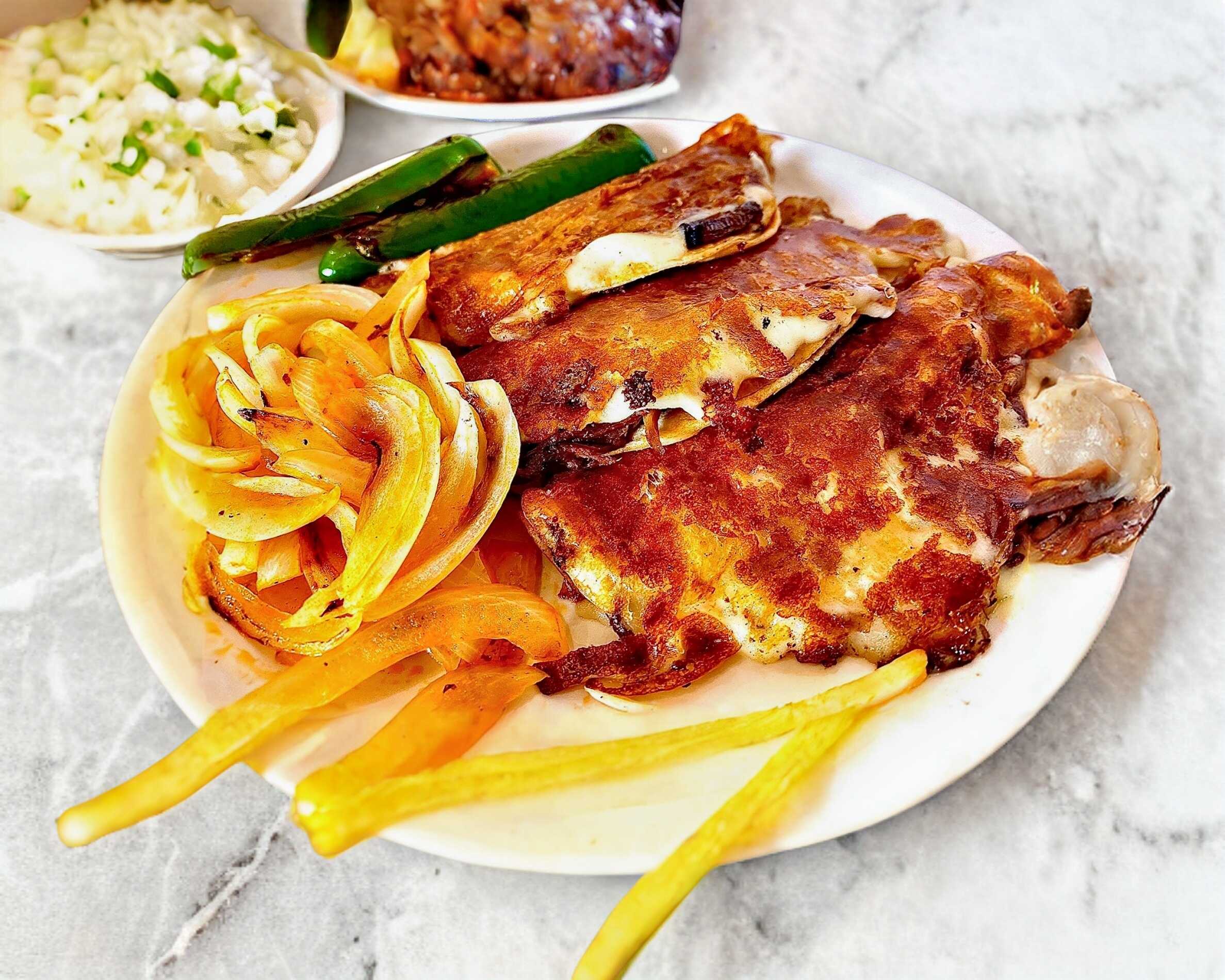 quesadilla doble de tortilla de harina grande, acompanada de consome, salsa y verduras