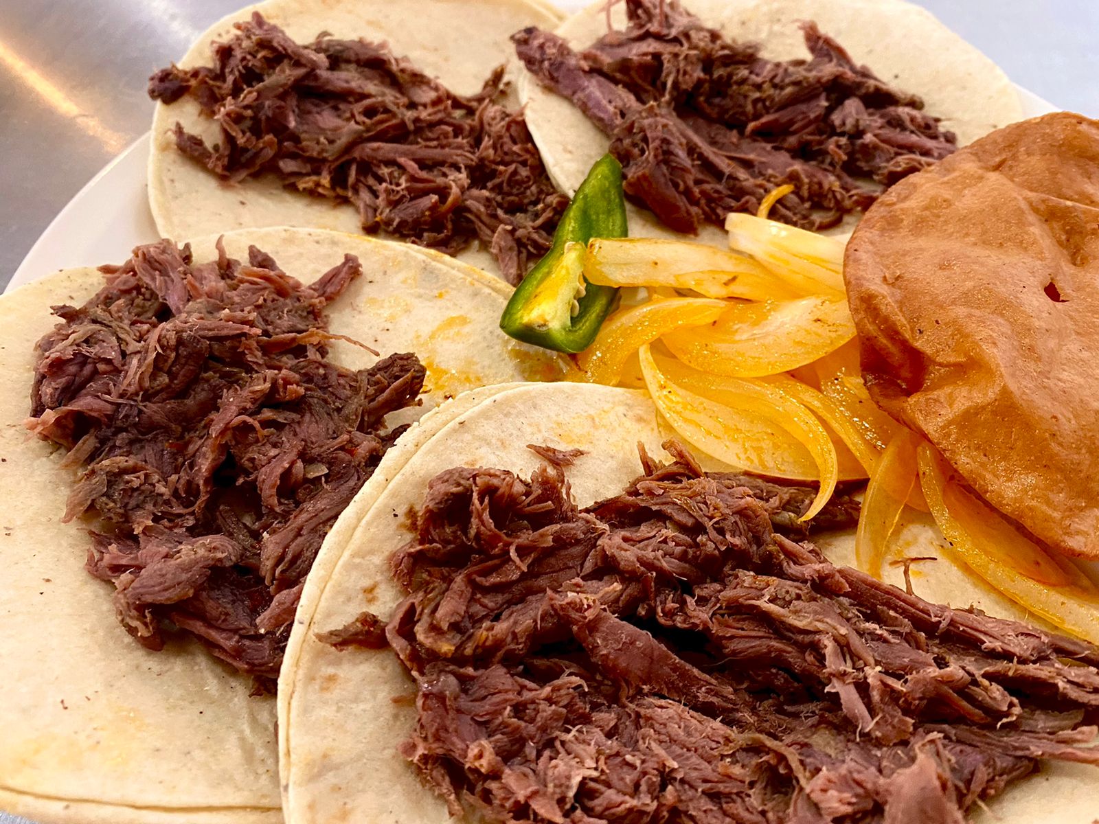 taco blando relleno de barbacoa y acompañado de consome salsa y verdura