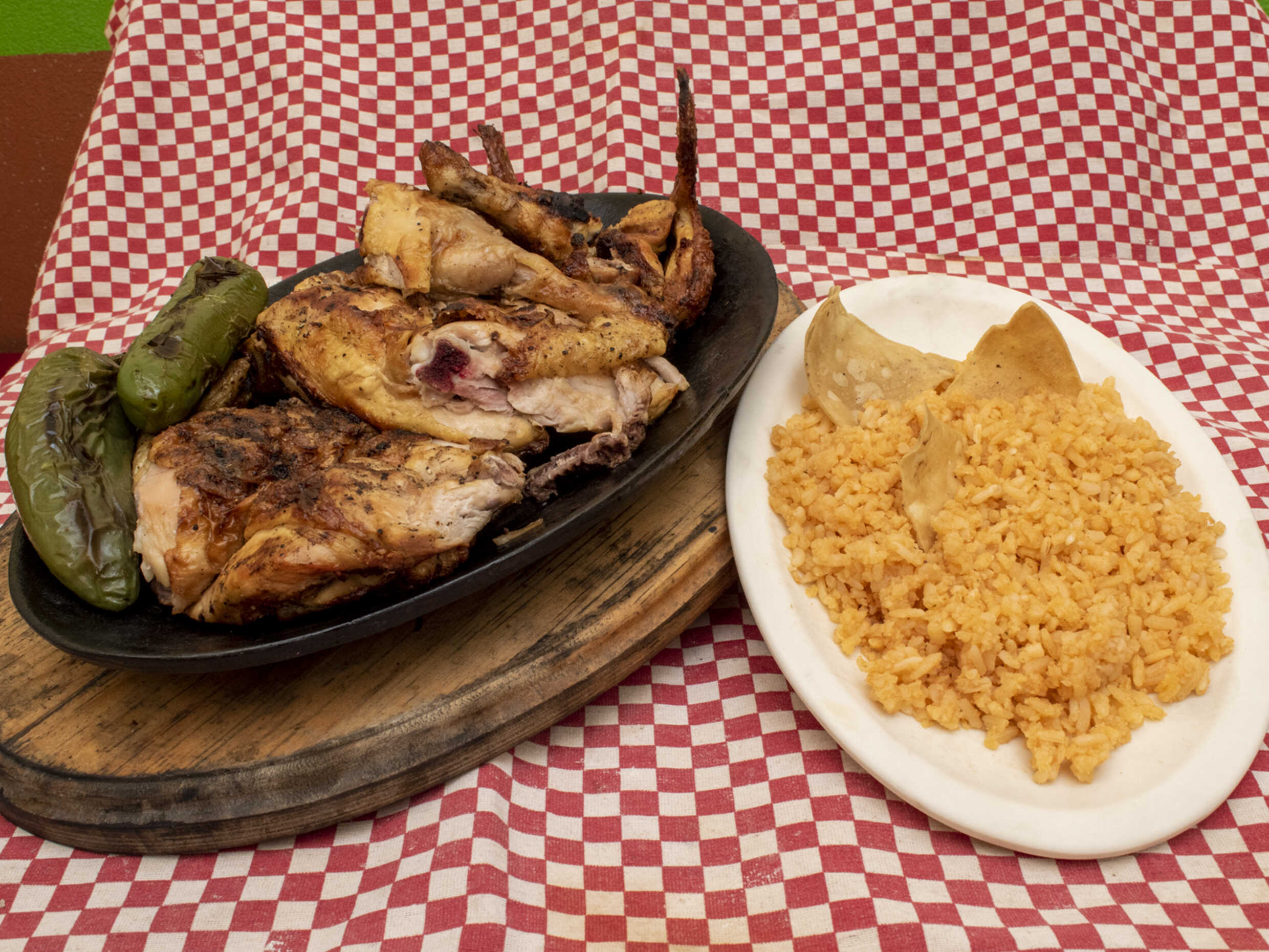 8 Piezas de pollo asado al carbón, acompañado con tortillas hechas a mano, salsas y chiles asados.