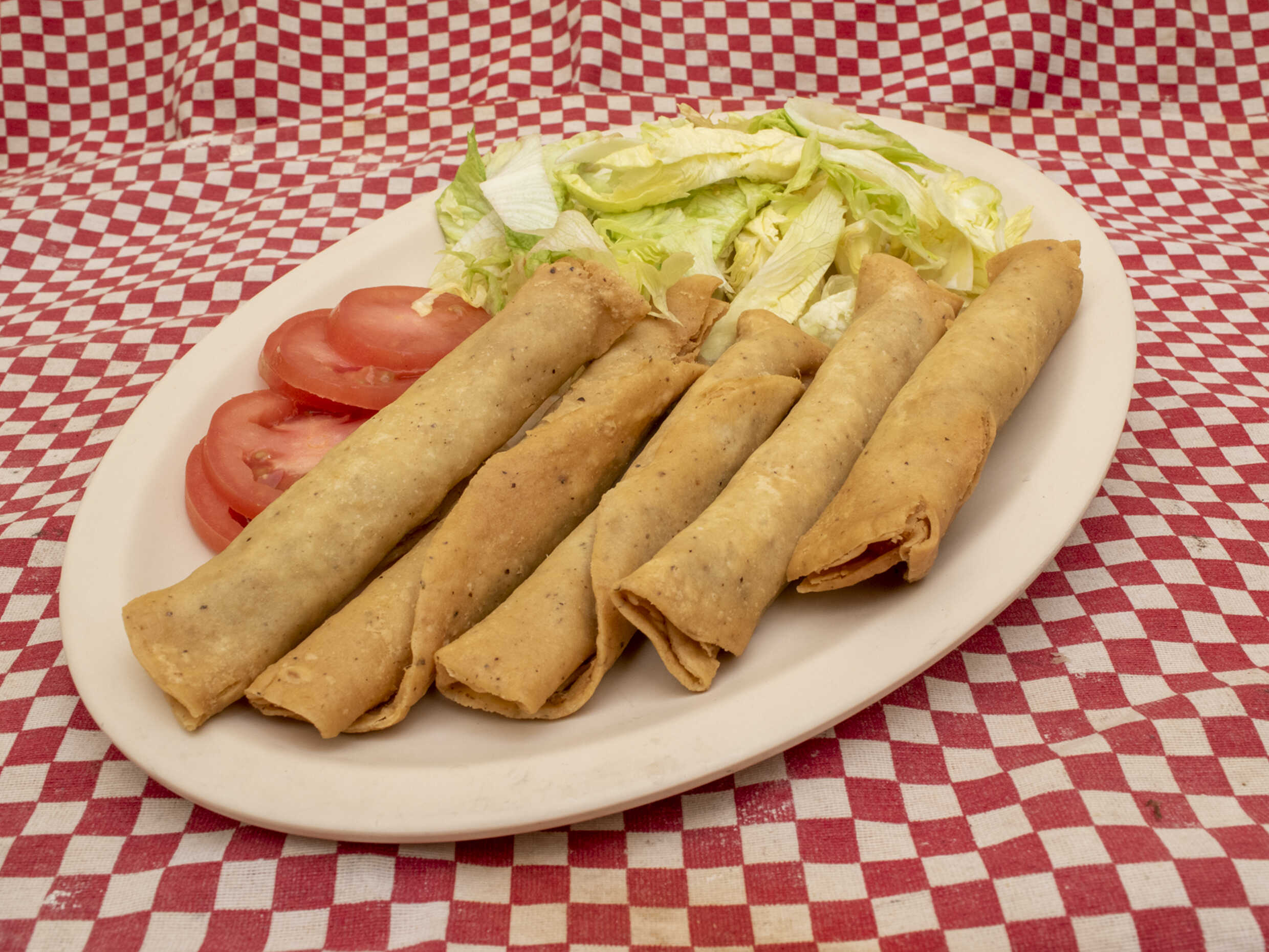 5 Deliciosas flautas de pollo acompañadas con verdura, crema y salsa.