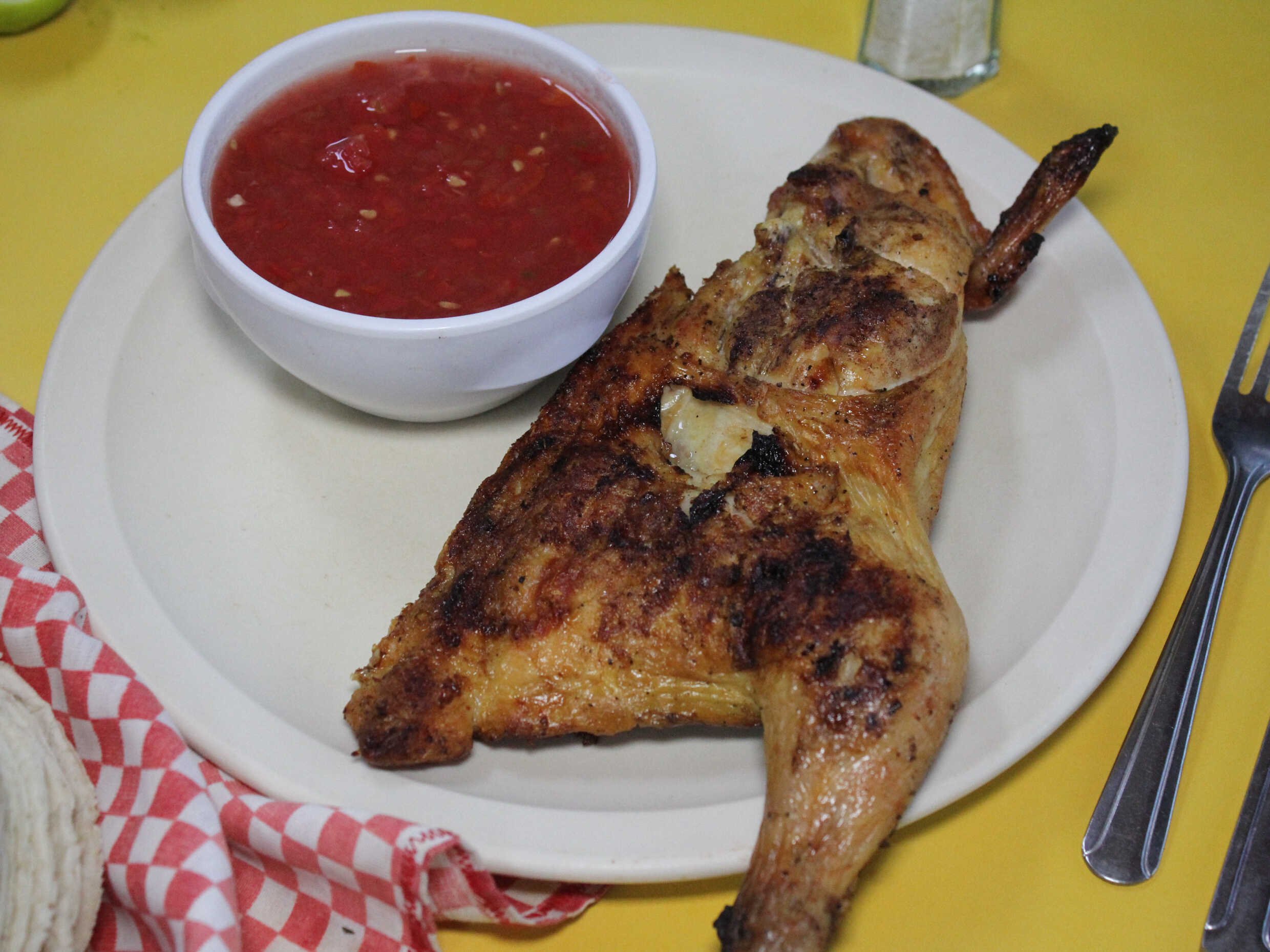 2 Piezas de pollo asado al carbón, acompañado con tortillas hechas a mano, salsas y chiles asados. Pechuga y ala