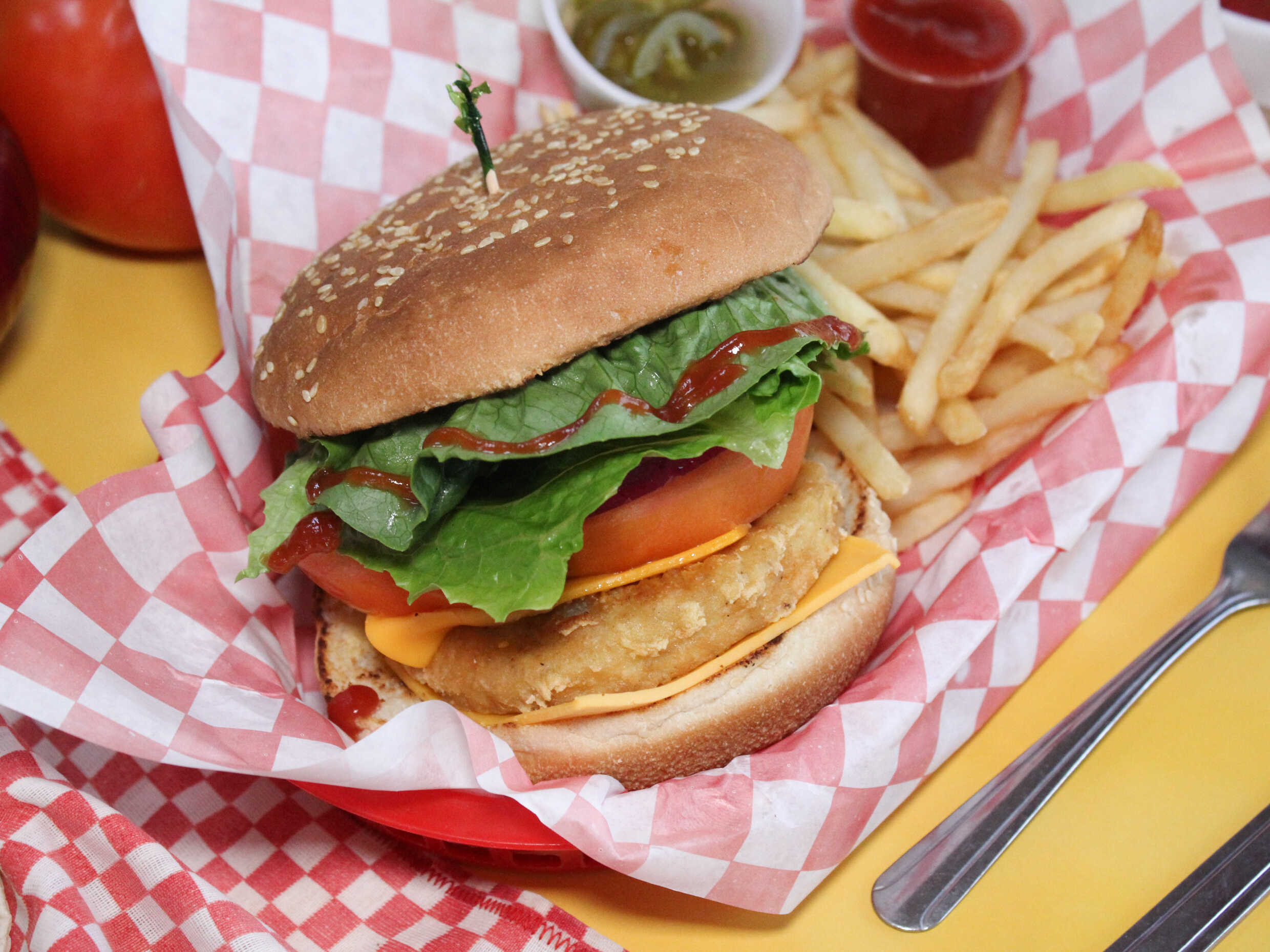 Hamburguesa de pollo, papas a la francesa y refresco.