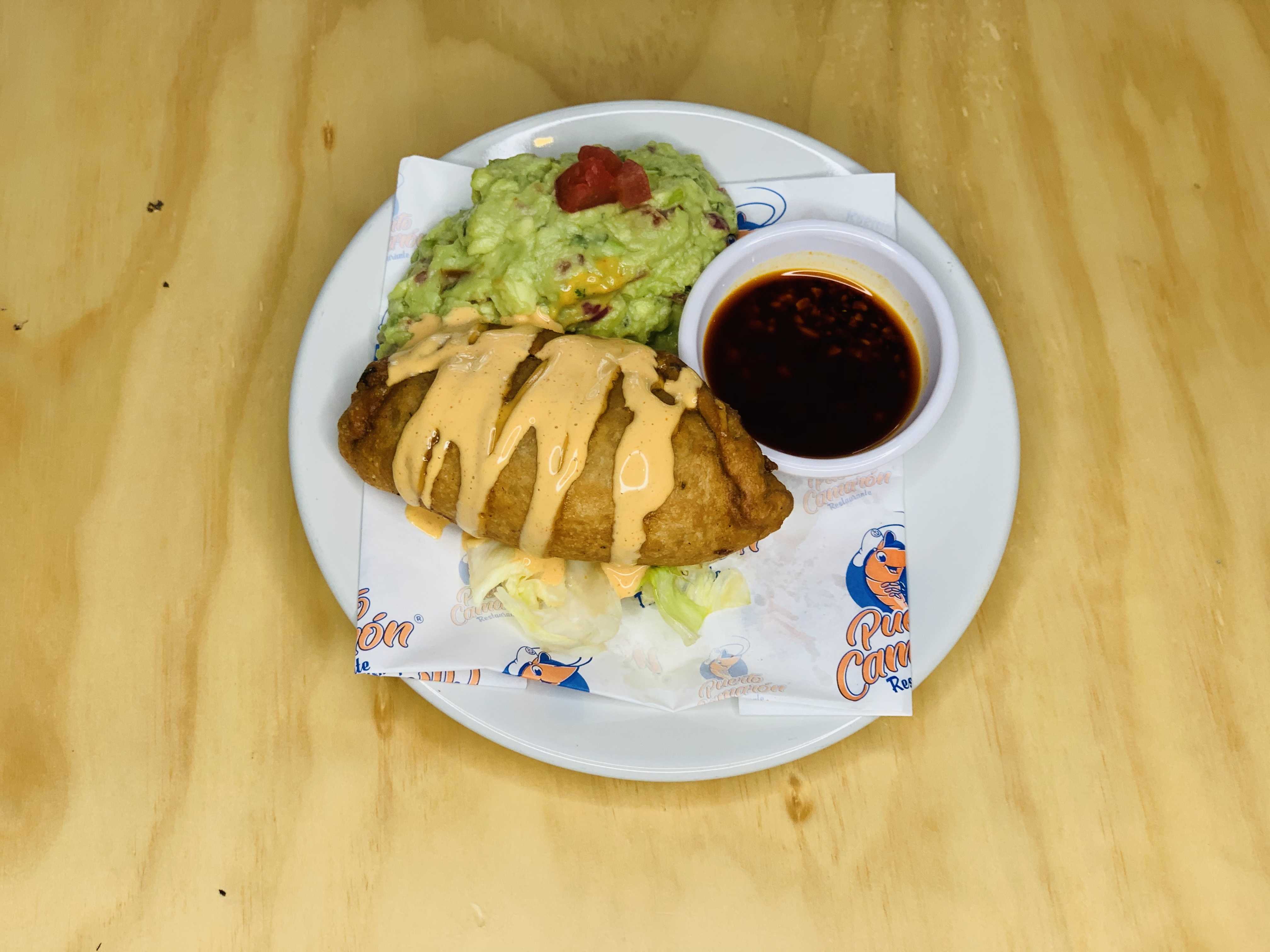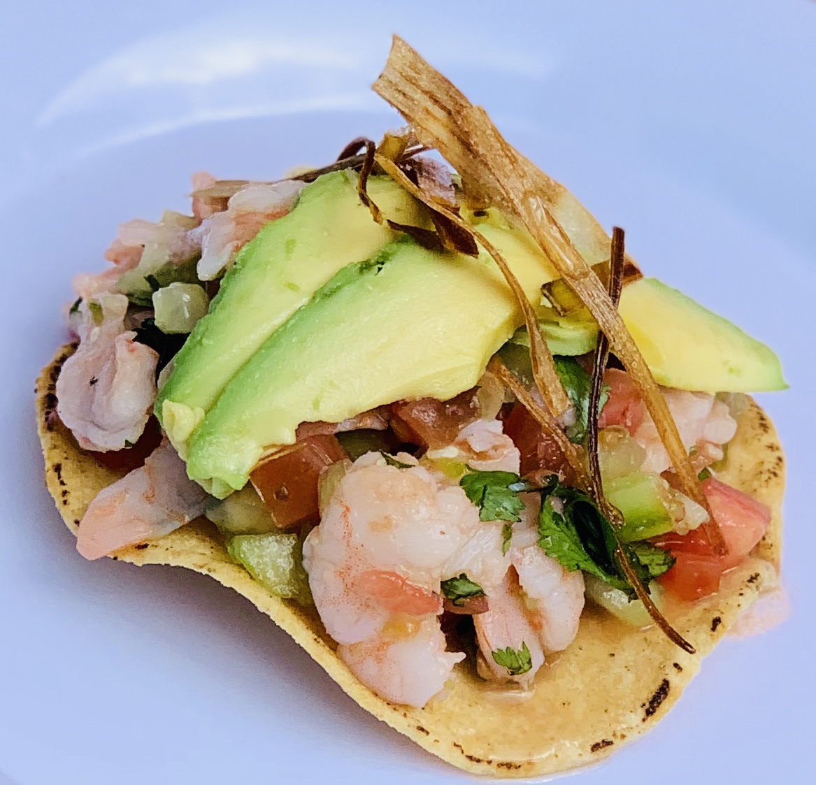 Camarones crocantes sobre una cama de guacamole y acompañado de tortillas.