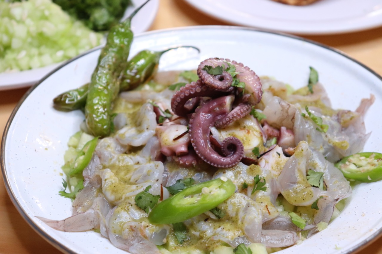 Ceviche caliente con camarón, pulpo y queso, bañado con salsa chimichurri y guacamole.