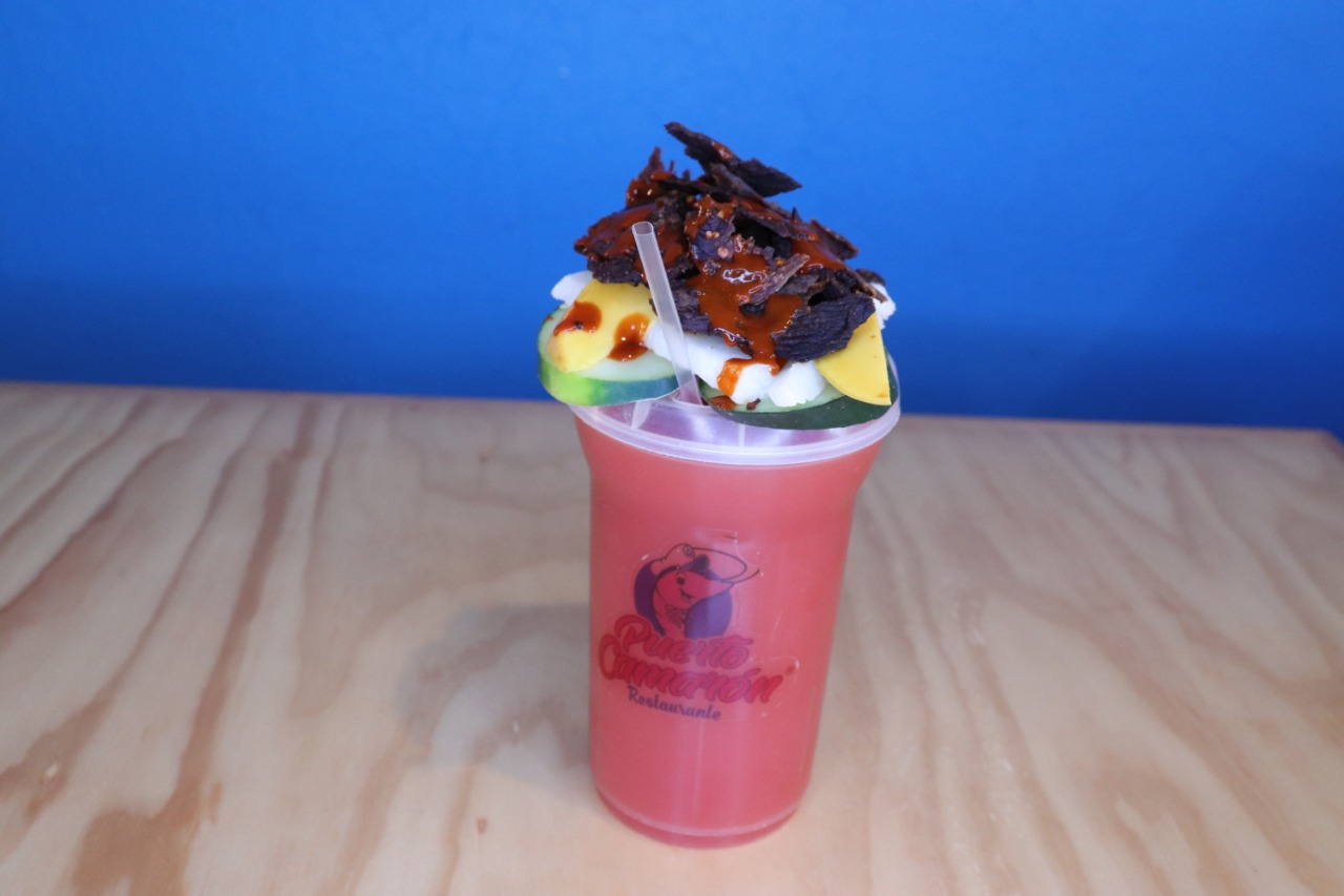 Cerveza con camarón, pulpo y camarón seco. Acompañado de pepino, jícama y zanahoria.