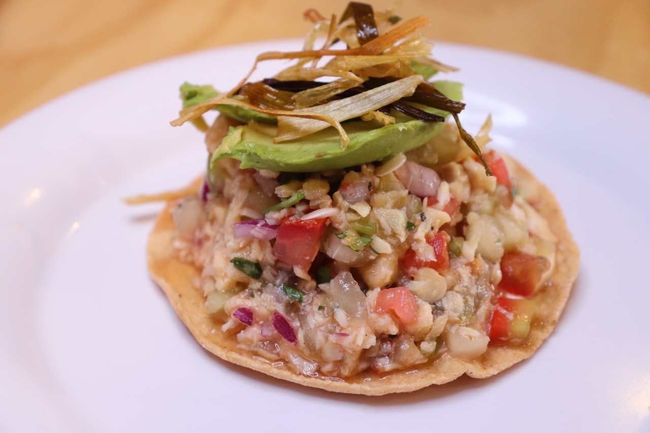Salmón en crocante de coco, mango, piña y salsa tártara.