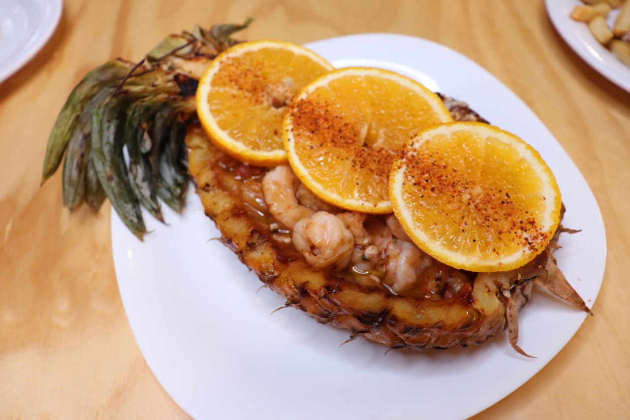 Camarón, mango, piña y jícama.