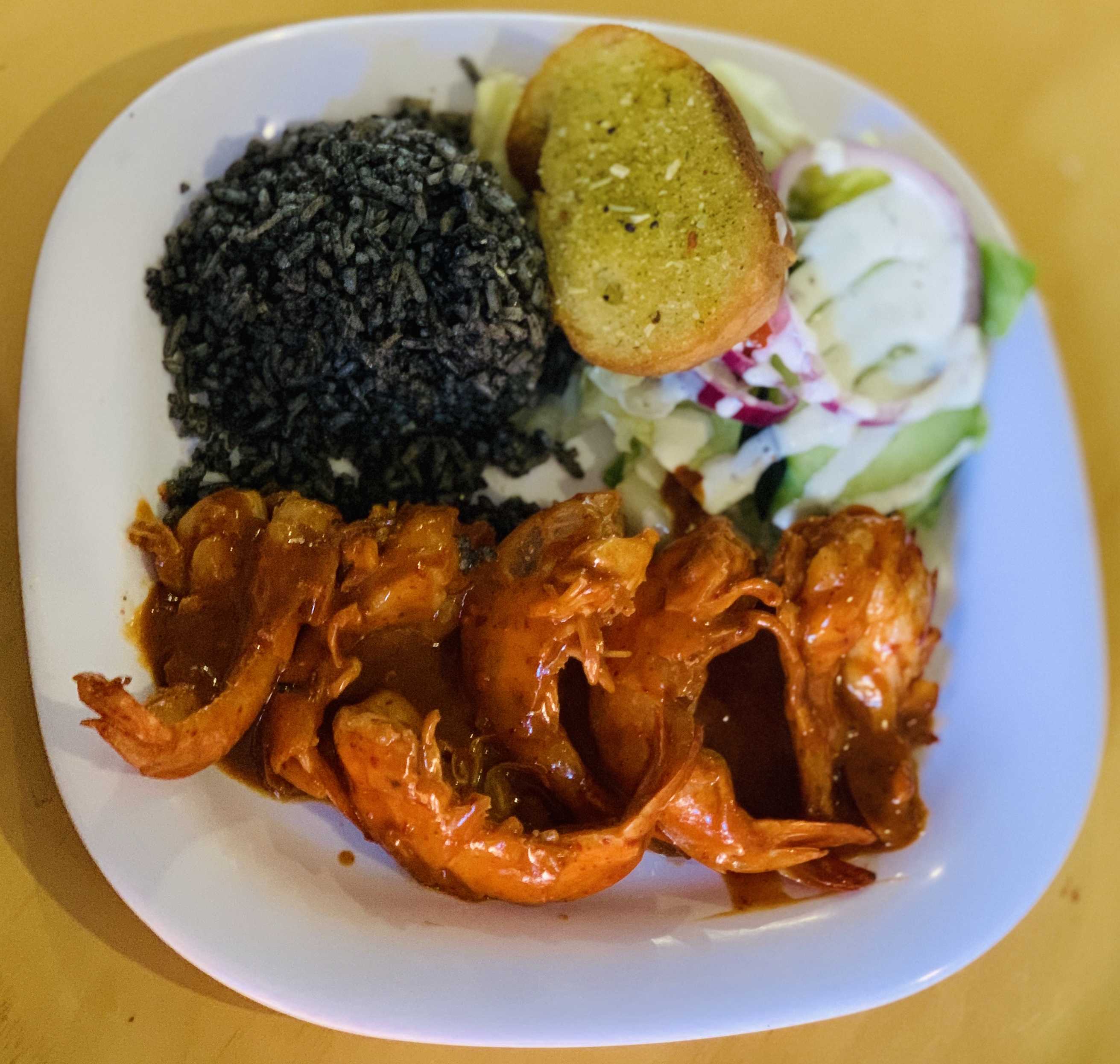 Acompañado de arroz negro o rojo, verduras y pan con hierbas finas. Queso, camarones, jitomate, cebolla morada, cilantro y sazonadores.