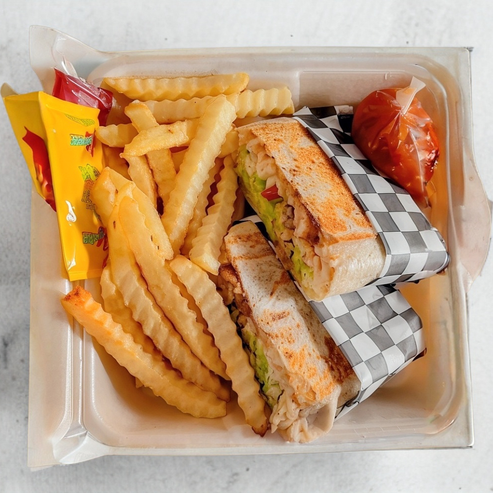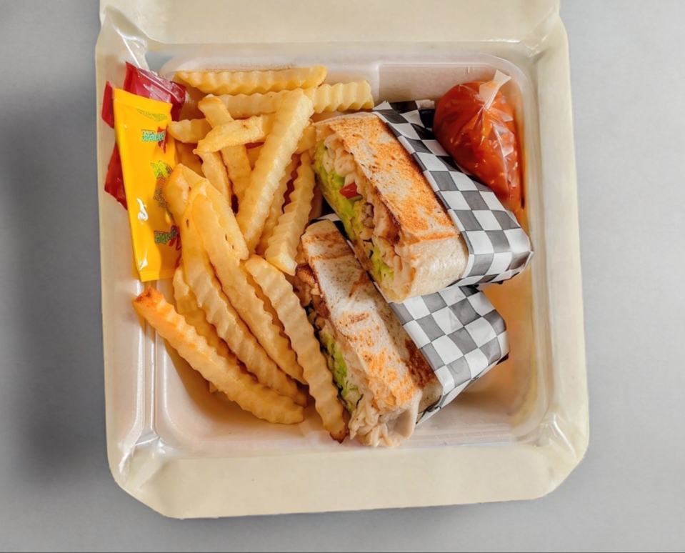 Tres piezas de pan, aderezados con mayonesa, pollo, jamón, tocino, queso, aguacate, jitomate, cebolla y lechuga acompañado de papas a la francesa