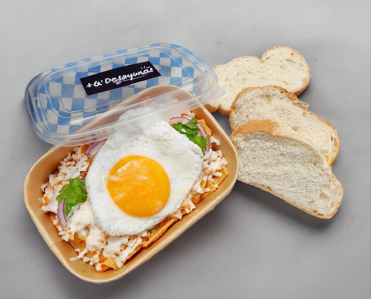 Huevos al gusto acompañados de chilaquilesy frijoles acompañados de bolillo