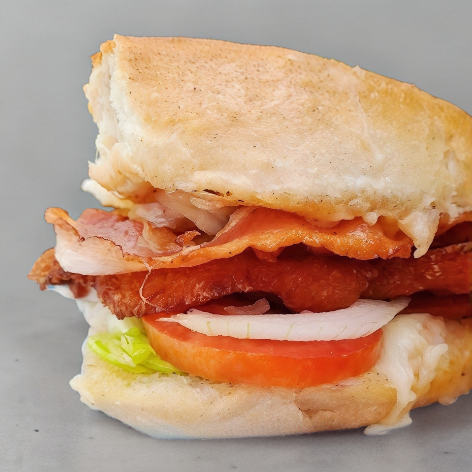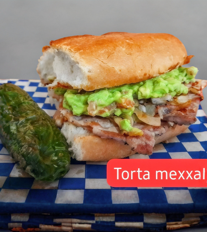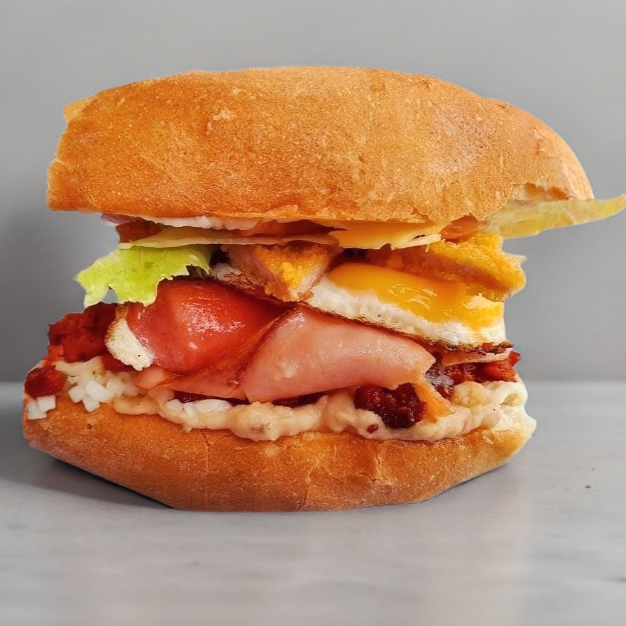 Pan aderezado con mayonesa, jamón,pollo a la plancha, queso, aguacate, jitomate, cebolla, lechuga, gratinado con más queso