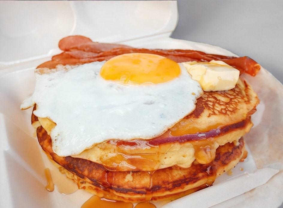 Tres piezas de hot cakes grandes y esponjosos con un huevo estrellado montado y tiras de tocino bañados con el sabor de tu preferencia