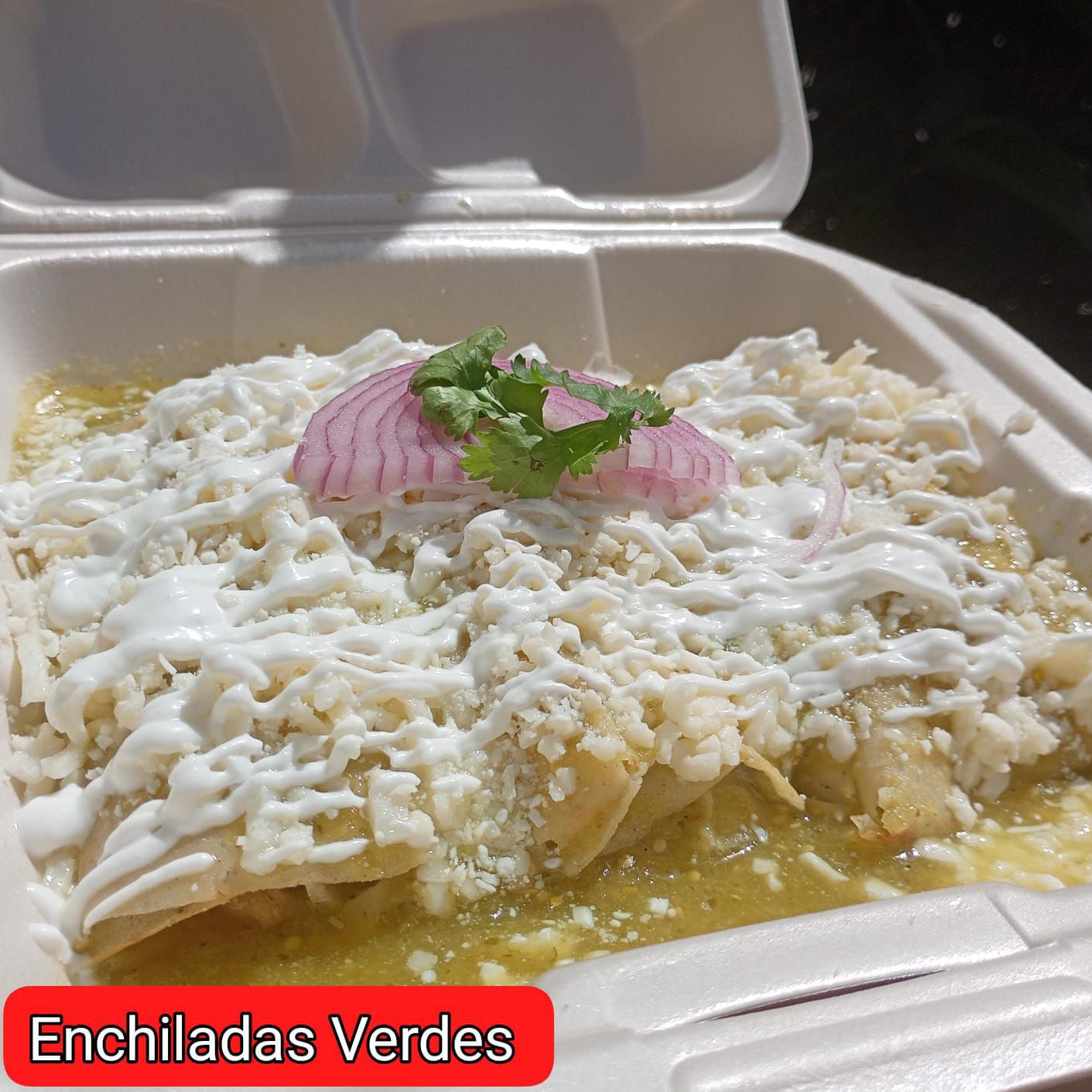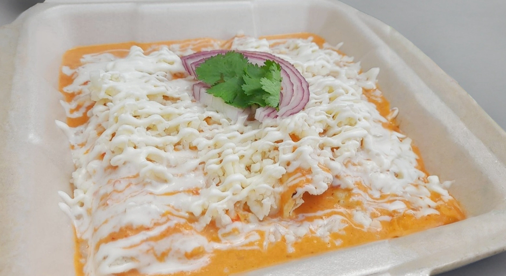 4 enchiladas de pollo, bañadas en salsa verde, preparadas con mezcla de quesos , crema y un poco de cebolla morada