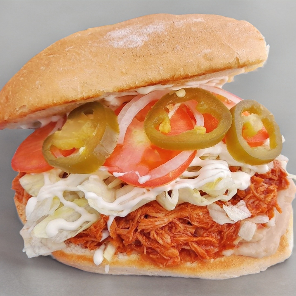 Pierna adobada, frijol, crema, lechuga, jitomate y cebolla. Acompañada de chiles jalapeños